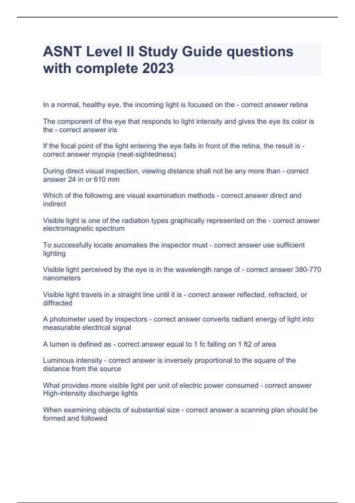 ASNT Level II Study Guide Questions With Complete & Verified Solutions 2024. In a normal, healthy eye, the incoming light is focused on the - correct answer retina The component of the eye that responds to light intensity and gives the eye its color is the - correct answer iris If the focal point of the light entering the eye falls in front of the retina, the result is - correct answer myopia (neat-sightedness) During direct visual inspection, viewing distance shall not be any more than - correct answer 24 in or 610 mm Which of the following are visual examination methods - correct answer direct and indirect Visible light is one of the radiation types graphically represented on the - correct answer electromagnetic spectrum To successfully locate anomalies the inspector must - correct answer use sufficient lighting Visible light perceived by the eye is in the wavelength range of - correct answer 380-770 nanometers Visible light travels in a straight line until it is - correct answer reflected, refracted, or diffracted A photometer used by inspectors - correct answer converts radiant energy of light into measurable electrical signal A lumen is defined as - correct answer equal to 1 fc falling on 1 ft2 of area Luminous intensity - correct answer is inversely proportional to the square of the distance from the source What provides more visible light per unit of electric power consumed - correct answer High-intensity discharge lights When examining objects of substantial size - correct answer a scanning plan should be formed and followed