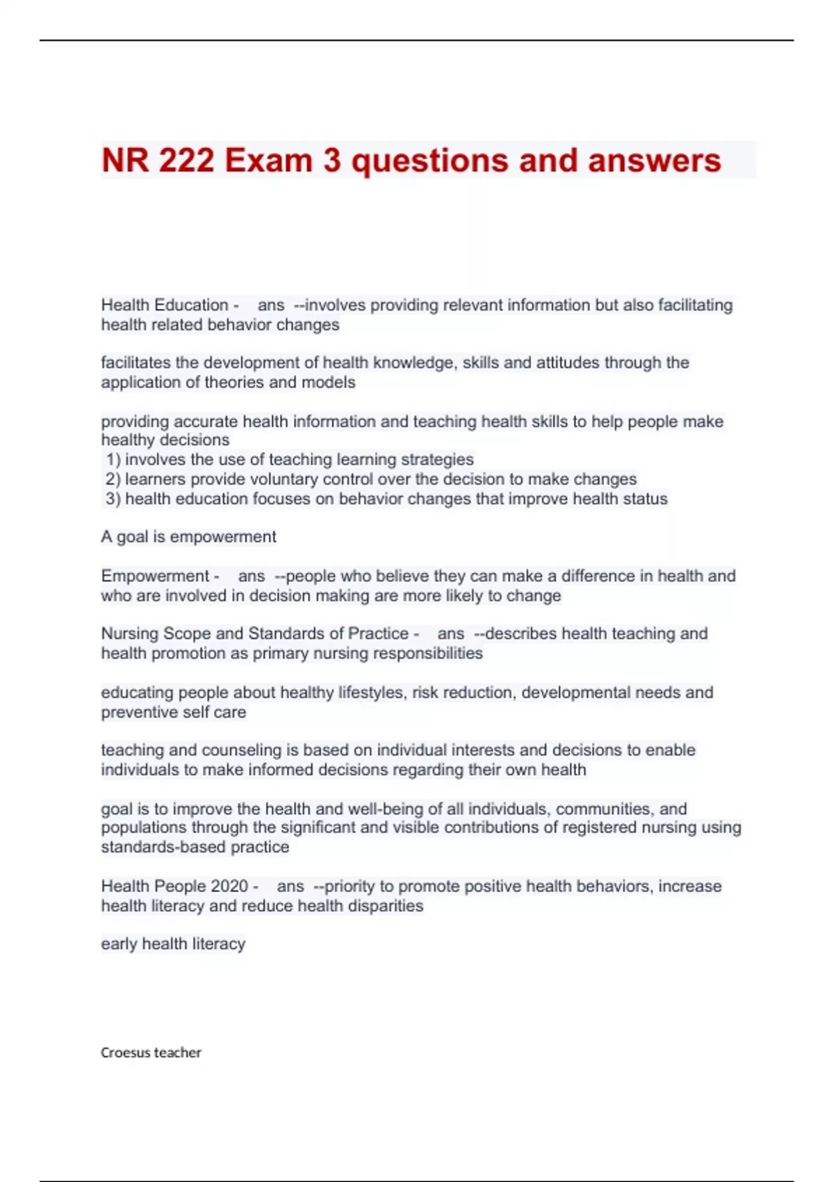 Health Education - ans --involves providing relevant information but also facilitating health related behavior changes facilitates the development of health knowledge, skills and attitudes through the application of theories and models providing accurate health information and teaching health skills to help people make healthy decisions 1) involves the use of teaching learning strategies 2) learners provide voluntary control over the decision to make changes 3) health education focuses on behavior changes that improve health status A goal is empowerment Empowerment - ans --people who believe they can make a difference in health and who are involved in decision making are more likely to change Nursing Scope and Standards of Practice - ans --describes health teaching and health promotion as primary nursing responsibilities educating people about healthy lifestyles, risk reduction, developmental needs and preventive self care teaching and counseling is based on individual interests and decisions to enable individuals to make informed decisions regarding their own health goal is to improve the health and well-being of all individuals, communities, and populations through the significant and visible contributions of registered nursing using standards-based practice Health People 2020 - ans --priority to promote positive health behaviors, increase health literacy and reduce health disparities early health literacy