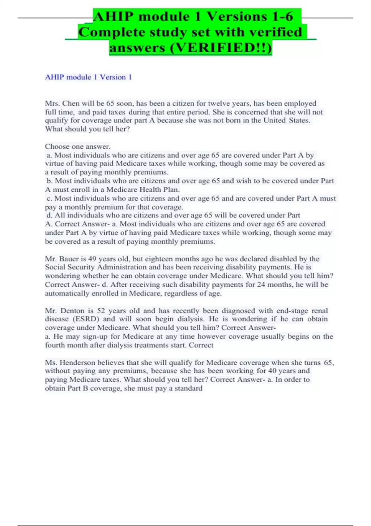 AHIP module 1 Versions 1-6 Complete study set with verified answers (VERIFIED!!) AHIP module 1 Version 1 Mrs. Chen will be 65 soon, has been a citizen for twelve years, has been employed full time, and paid taxes during that entire period. She is concerned that she will not qualify for coverage under part A because she was not born in the United States. What should you tell her? Choose one answer. a. Most individuals who are citizens and over age 65 are covered under Part A by virtue of having paid Medicare taxes while working, though some may be covered as a result of paying monthly premiums. b. Most individuals who are citizens and over age 65 and wish to be covered under Part A must enroll in a Medicare Health Plan. c. Most individuals who are citizens and over age 65 and are covered under Part A must pay a monthly premium for that coverage. d. All individuals who are citizens and over age 65 will be covered under Part A. Correct Answer- a. Most individuals who are citizens and over age 65 are covered under Part A by virtue of having paid Medicare taxes while working, though some may be covered as a result of paying monthly premiums. Mr. Bauer is 49 years old, but eighteen months ago he was declared disabled by the Social Security Administration and has been receiving disability payments. He is wondering whether he can obtain coverage under Medicare. What should you tell him? Correct Answer- d. After receiving such disability payments for 24 months, he will be automatically enrolled in Medicare, regardless of age. Mr. Denton is 52 years old and has recently been diagnosed with end-stage renal disease (ESRD) and will soon begin dialysis. He is wondering if he can obtain coverage under Medicare. What should you tell him? Correct Answer- a. He may sign-up for Medicare at any time however coverage usually begins on the fourth month after dialysis treatments start. Correct Ms. Henderson believes that she will qualify for Medicare coverage when she turns 65, without paying any premiums, because she has been working for 40 years and paying Medicare taxes. What should you tell her? Correct Answer- a. In order to obtain Part B coverage, she must pay a standard monthly premium, though it is higher for individuals with higher incomes. Correct Mr. Diaz continued working with his company and was insured under his employer's group plan until he reached age 68. He has heard that there is a premium penalty for those who did not sign up for Part B when first eligible and wants to know how much he will have to pay. What should you tell him? Correct Answer- b. Mr. Diaz will not pay any penalty because he had continuous coverage under his employer's plan. Correct Mrs. Peňa is 66 years old, has coverage under an employer plan and will retire next year. She heard she must enroll in Part B at the beginning of the year to ensure no gap in coverage. What can you tell her? Correct Answer- d. She may enroll at any time while she is covered under her employer plan, but she will have a special eight-month enrollment period that differs from the standard general enrollment period, during which she may enroll in Medicare Part B. Correct Mrs. Kelly, age 65, is entitled to Part A, but has not yet enrolled in Part B. She is considering enrollment in a Medicare health plan (Part C). What should you advise her to do before she will be able to enroll into a Medicare health plan? Correct Answer- Mrs. Kelly, age 65, is entitled to Part A, but has not yet enrolled in Part B. She is considering enrollment in a Medicare health plan (Part C). What should you advise her to do before she will be able to enroll into a Medicare health plan? Mrs. Park is an elderly retiree. She has a low, fixed income. What could you tell Mrs. Park that might be of assistance? Correct Answer- d. She should contact her state Medicaid agency to see if she qualifies for one of several programs that can help with Medicare costs for which she is responsible. Correct Mr. Wu is eligible for Medicare. He has limited financial resources but failed to qualify for the Part D low-income subsidy. Where might he turn for help with his prescription drug costs? Correct Answer- a. Mr. Wu may still qualify for help in paying Part D costs through his State Pharmaceutical Assistance Program. Correct Mr. Patel is in good health and is preparing a budget in anticipation of his retirement when he turns 66. He wants to understand the health care costs he might be exposed to under Medicare if he were to require hospitalization as a result of an illness. In general terms, what could you tell him about his costs for inpatient hospital services under Original Medicare? Correct Answer- d. Under Original Medicare, there is a single deductible amount due for the first 60 days of any inpatient hospital stay, after which it converts into a per- day coinsurance amount through day 90. After day 90, he would pay a daily