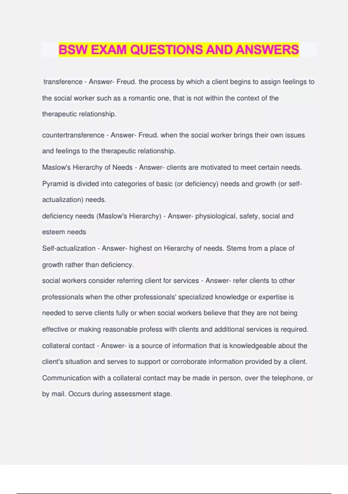 BSW EXAM QUESTIONS AND ANSWERS transference - Answer- Freud. the process by which a client begins to assign feelings to the social worker such as a romantic one, that is not within the context of the therapeutic relationship. countertransference - Answer- Freud. when the social worker brings their own issues and feelings to the therapeutic relationship. Maslow's Hierarchy of Needs - Answer- clients are motivated to meet certain needs. Pyramid is divided into categories of basic (or deficiency) needs and growth (or self- actualization) needs. deficiency needs (Maslow's Hierarchy) - Answer- physiological, safety, social and esteem needs Self-actualization - Answer- highest on Hierarchy of needs. Stems from a place of growth rather than deficiency. social workers consider referring client for services - Answer- refer clients to other professionals when the other professionals' specialized knowledge or expertise is needed to serve clients fully or when social workers believe that they are not being effective or making reasonable profess with clients and additional services is required. collateral contact - Answer- is a source of information that is knowledgeable about the client's situation and serves to support or corroborate information provided by a client. Communication with a collateral contact may be made in person, over the telephone, or by mail. Occurs during assessment stage. assessment stage - Answer- a client is the source of providing essential information upon which to define the problem and solutions Engagement stage - Answer- First stage of problem-solving process where sw meets clt., establishes the clt's rationale for seeking help and begins to establish rapport. planning stage - Answer- goals are developed to help the client move toward their preferred lifestyle. intervention stage - Answer- client and sw work together to help the client make progress towards goals and objectives Generalist Intervention Model (GIM) - Answer- engagement, assessment, planning, implementation, eval., termination, follow up formative evaluation - Answer- typically assessed during their development or early implementation to provide information about how best to revise and modify for improvement. This type of evaluation often is helpful for pilot projects and new programs, but can be used for progress monitoring of ongoing programs Summative evaluation - Answer- Occurs at the end of services and provide an overall description of their effectiveness. It examines outcomes to determine whether objectives were met. Enables decisions to be made regarding future service directions that cannot be made during implementation. (Cost-benefit analyses) needs assessment - Answer- a systematic process for determining and addressing needs, or "gaps" between current conditions and desired conditions or "wants". The discrepancy between the current condition and wanted condition must be measured to appropriately identify the need