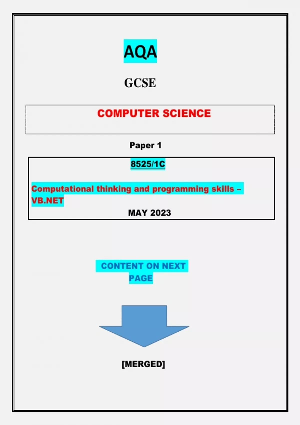 AQA GCSE COMPUTER SCIENCE Paper 1 8525/1C Computational thinking and programming skills – VB.NET||GRADED A+||MERGED||