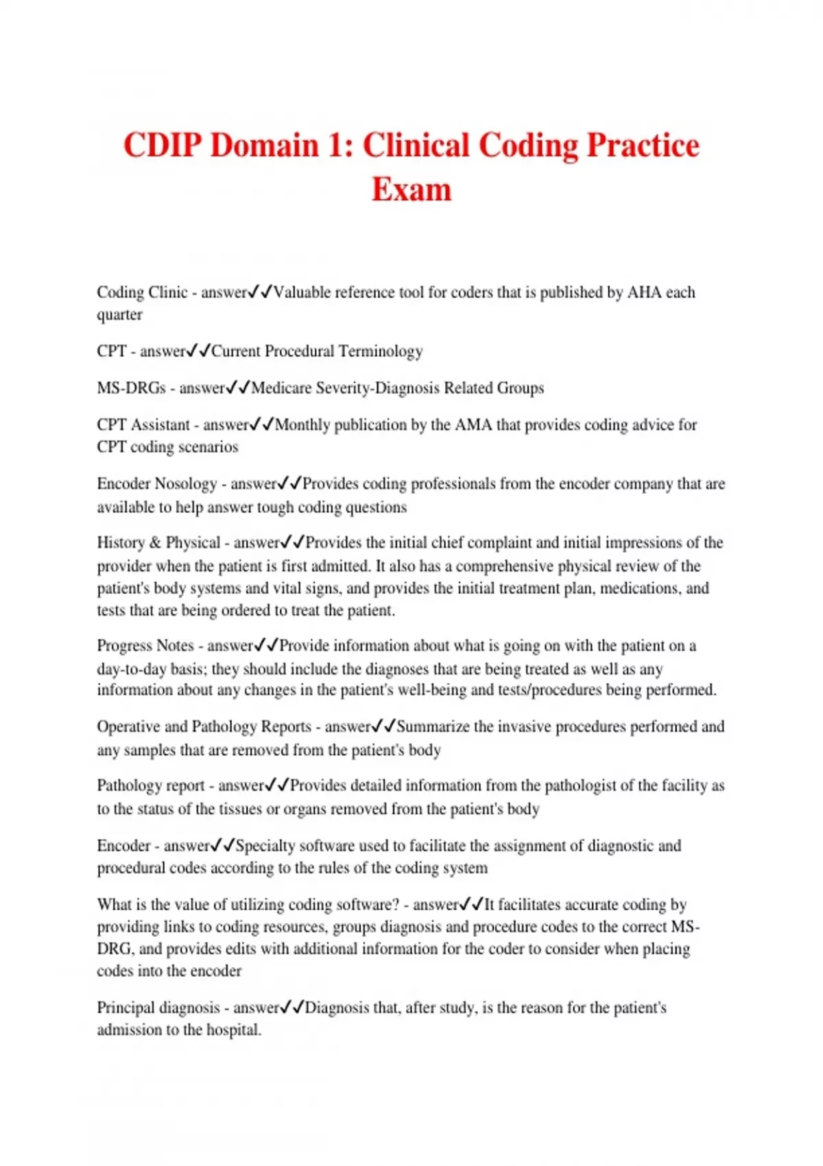 CDIP Domain 1: Clinical Coding Practice Exam Coding Clinic - answerValuable reference tool for coders that is published by AHA each quarter CPT - answerCurrent Procedural Terminology MS-DRGs - answerMedicare Severity-Diagnosis Related Groups CPT Assistant - answerMonthly publication by the AMA that provides coding advice for CPT coding scenarios Encoder Nosology - answerProvides coding professionals from the encoder company that are available to help answer tough coding questions History & Physical - answerProvides the initial chief complaint and initial impressions of the provider when the patient is first admitted. It also has a comprehensive physical review of the patient's body systems and vital signs, and provides the initial treatment plan, medications, and tests that are being ordered to treat the patient. Progress Notes - answerProvide information about what is going on with the patient on a day-to-day basis; they should include the diagnoses that are being treated as well as any information about any changes in the patient's well-being and tests/procedures being performed. Operative and Pathology Reports - answerSummarize the invasive procedures performed and any samples that are removed from the patient's body Pathology report - answerProvides detailed information from the pathologist of the facility as to the status of the tissues or organs removed from the patient's body Encoder - answerSpecialty software used to facilitate the assignment of diagnostic and procedural codes according to the rules of the coding system What is the value of utilizing coding software? - answerIt facilitates accurate coding by providing links to coding resources, groups diagnosis and procedure codes to the correct MS- DRG, and provides edits with additional information for the coder to consider when placing codes into the encoder Principal diagnosis - answerDiagnosis that, after study, is the reason for the patient's admission to the hospital.