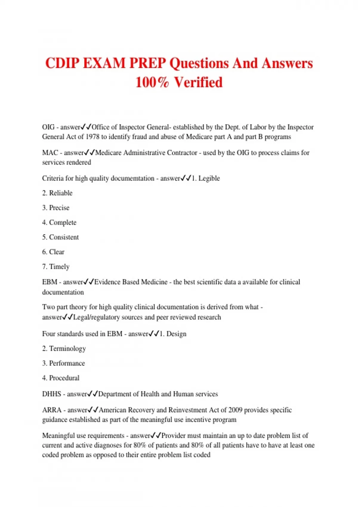 CDIP EXAM PREP Questions And Answers 100% Verified OIG - answerOffice of Inspector General- established by the Dept. of Labor by the Inspector General Act of 1978 to identify fraud and abuse of Medicare part A and part B programs MAC - answerMedicare Administrative Contractor - used by the OIG to process claims for services rendered Criteria for high quality documemtation - answer1. Legible 2. Reliable 3. Precise 4. Complete 5. Consistent 6. Clear 7. Timely EBM - answerEvidence Based Medicine - the best scientific data a available for clinical documentation Two part theory for high quality clinical documentation is derived from what - answerLegal/regulatory sources and peer reviewed research