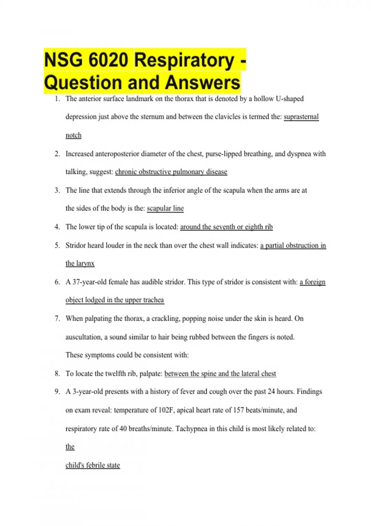 NSG 6020 Respiratory - Question and Answers 1. The anterior surface landmark on the thorax that is denoted by a hollow U-shaped depression just above the sternum and between the clavicles is termed the: suprasternal notch 2. Increased anteroposterior diameter of the chest, purse-lipped breathing, and dyspnea with talking, suggest: chronic obstructive pulmonary disease 3. The line that extends through the inferior angle of the scapula when the arms are at the sides of the body is the: scapular line 4. The lower tip of the scapula is located: around the seventh or eighth rib 5. Stridor heard louder in the neck than over the chest wall indicates: a partial obstruction in the larynx 6. A 37-year-old female has audible stridor. This type of stridor is consistent with: a foreign object lodged in the upper trachea 7. When palpating the thorax, a crackling, popping noise under the skin is heard. On auscultation, a sound similar to hair being rubbed between the fingers is noted. These symptoms could be consistent with: 8. To locate the twelfth rib, palpate: between the spine and the lateral chest 9. A 3-year-old presents with a history of fever and cough over the past 24 hours. Findings on exam reveal: temperature of 102F, apical heart rate of 157 beats/minute, and respiratory rate of 40 breaths/minute. Tachypnea in this child is most likely related to: the child's febrile state