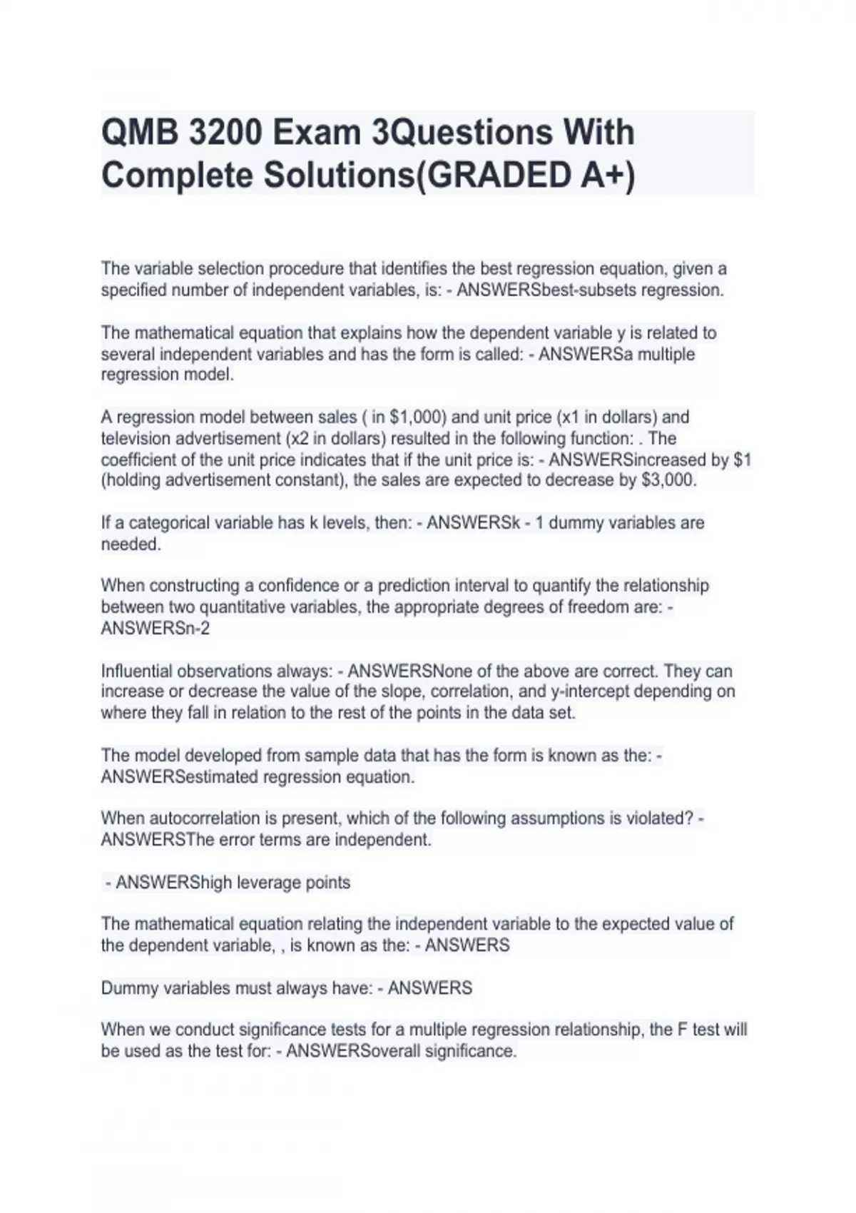 qmb 3200 exam 3questions with complete solutionsg