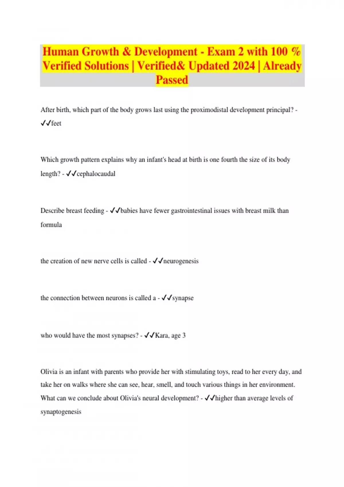 Human Growth & Development - Exam 2 with 100 % Verified Solutions | Verified& Updated 2024 | Already Passed After birth, which part of the body grows last using the proximodistal development principal? - feet Which growth pattern explains why an infant's head at birth is one fourth the size of its body length? - cephalocaudal Describe breast feeding - babies have fewer gastrointestinal issues with breast milk than formula the creation of new nerve cells is called - neurogenesis the connection between neurons is called a - synapse who would have the most synapses? - Kara, age 3 Olivia is an infant with parents who provide her with stimulating toys, read to her every day, and take her on walks where she can see, hear, smell, and touch various things in her environment. What can we conclude about Olivia's neural development? - higher than average levels of synaptogenesis