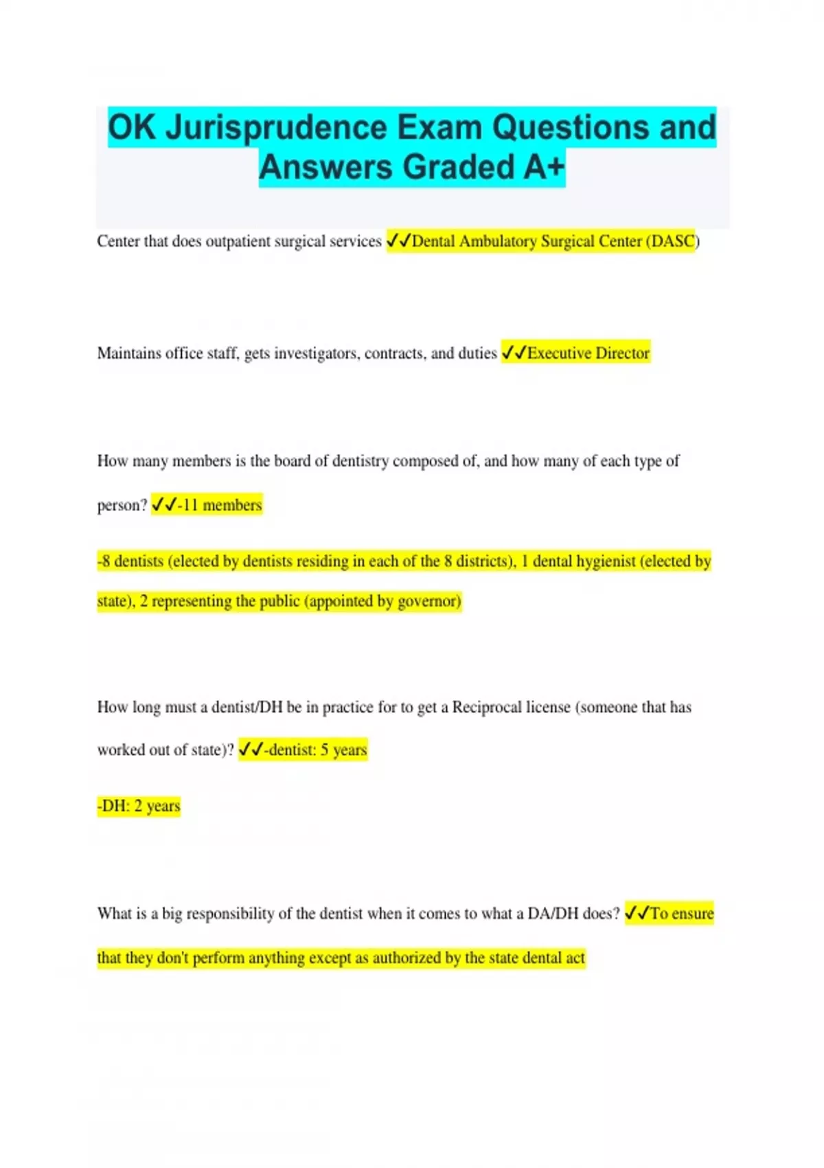 OK Jurisprudence Exam Questions and Answers Graded A+ Center that does outpatient surgical services Dental Ambulatory Surgical Center (DASC) Maintains office staff, gets investigators, contracts, and duties Executive Director How many members is the board of dentistry composed of, and how many of each type of person? -11 members -8 dentists (elected by dentists residing in each of the 8 districts), 1 dental hygienist (elected by state), 2 representing the public (appointed by governor) How long must a dentist/DH be in practice for to get a Reciprocal license (someone that has worked out of state)? -dentist: 5 years -DH: 2 years What is a big responsibility of the dentist when it comes to what a DA/DH does? To ensure that they don't perform anything except as authorized by the state dental act What can the following be called: -anything federal, state, tribal -private -group home/residential care -hospital/nursing home/DASC -public/private school -pt of record private residence -mobile unit Treatment facilities When the Dentist is on site at all times before, during, and after procedures being performed and before dismissal of the pt, evaluates the results of dental tx Direct supervision Supervisory dentist has direct ongoing visual oversight at all times during procedure Direct visual supervision Dentist diagnoses tx within past 13 months; May ONLY be used to supervise a hygienist and may not be used to supervise a DA or OMSA; will evaluate tx within a reasonable time General supervision Dentist is in office and has diagnosed conditions to be tx; authorizes procedures to be performed by the DH and remains in the office while tx is performed (may NOT be used for assistants. Indirect supervision How long is a term for board members and how many terms can they serve? -3 years -no more than 3 consecutive terms (9 yrs) How can a DH/dentist be eligible to be on the board? Must have been licensed to practice in Oklahoma for 5 years and not had any penalties in the 5 years Dentist/DH members can be removed from the board by ______% election from the dentists/DH residing in the same district/state. These election ballots have to be mailed to those entitled to vote at least ______ days prior to the date of counting the ballots. -20%; 30 days Within how many days should a vacancy among a dentist/DH member of the board be filled? Within 60 days after the vacancy occurs What are the 5 committees of the board of dentistry that meet once per year and other times as needed? 1) dental practice committee 2) anesthetic committee