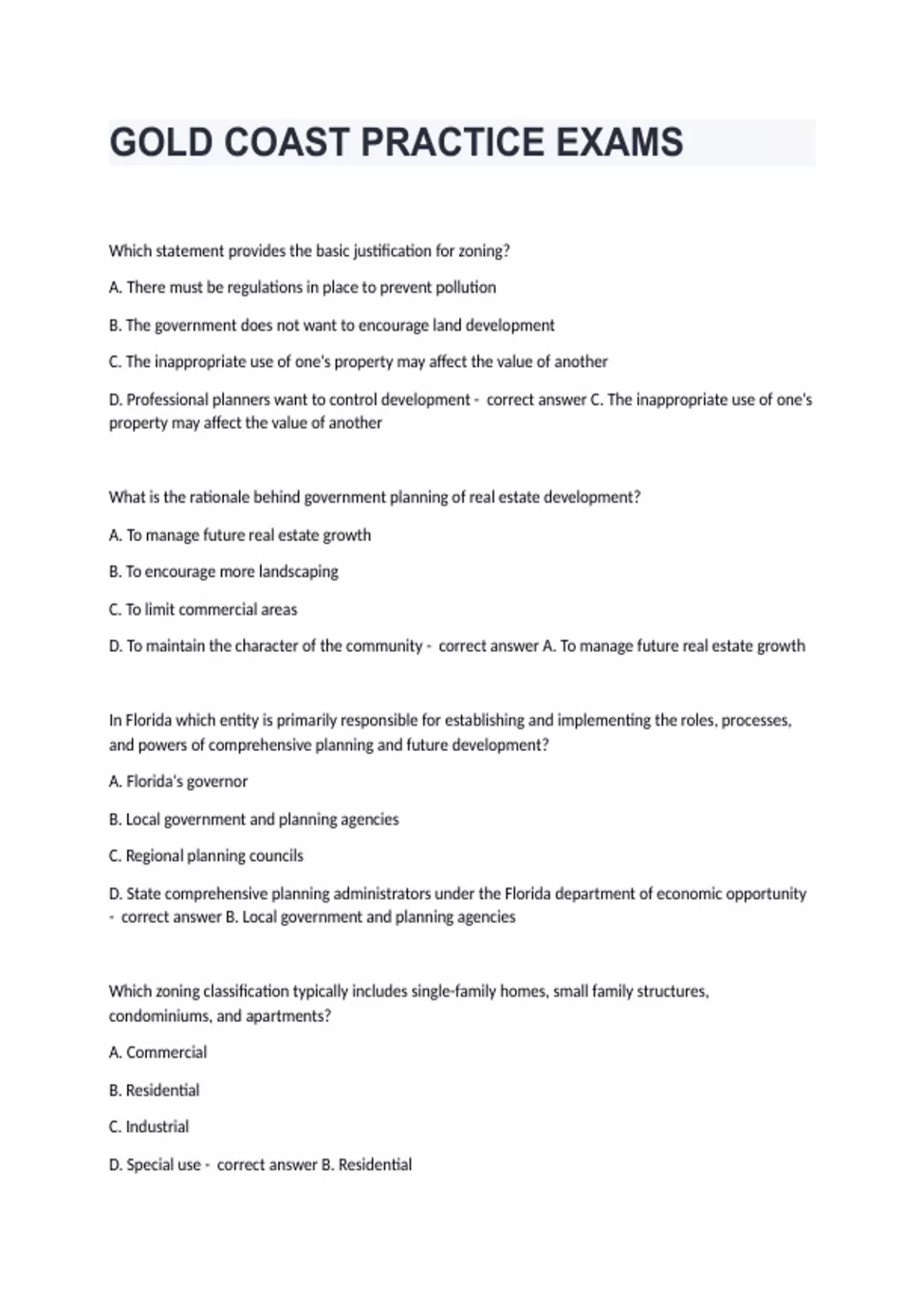 GOLD COAST PRACTICE EXAMSWhich statement provides the basic justification for zoning? A. There must be regulations in place to prevent pollution B. The government does not want to encourage land development C. The inappropriate use of one's property may affect the value of another D. Professional planners want to control development - correct answer C. The inappropriate use of one's property may affect the value of another What is the rationale behind government planning of real estate development? A. To manage future real estate growth B. To encourage more landscaping C. To limit commercial areas D. To maintain the character of the community - correct answer A. To manage future real estate growth In Florida which entity is primarily responsible for establishing and implementing the roles, processes, and powers of comprehensive planning and future development? A. Florida's governor B. Local government and planning agencies C. Regional planning councils D. State comprehensive planning administrators under the Florida department of economic opportunity - correct answer B. Local government and planning agencies Which zoning classification typically includes single-family homes, small family structures, condominiums, and apartments? A. Commercial B. Residential C. Industrial D. Special use - correct answer B. Residential Which statement best describes the master plan? A. It must be inflexible B. It is prepared by the state legislator C. It stops growth D. It serves as a guide for an area's future growth - correct answer D. It serves as a guide for an area's future growth Which of the following would a church need in order to build in a residential neighborhood? A. Public zoning permit B. Special exception C. Variance D. Nonconforming use permit - correct answer B. Special exception What is the purpose of the zoning board of adjustment? A. To settle monetary claims by property owners B. To grant variances and special exceptions C. To develop the comprehensive plan D. To determine infrastructure requirements - correct answer B. To grant variances and special exceptions Which term is used to describe a property use that predates the current zoning ordinance but is allowed to exist for at least a period of time? A. Legally conforming B. Progressive C. Legally nonconforming D. Capitalized - correct answer C. Legally nonconforming Which statement which best describes a Planned Unit Development (PUD)? A. A PUD offers fewer amenities than are possible with more traditional forms of zoning B. A PUD impacts the environment to a greater degree than most zoning classifications C. A PUD prohibits the use of zero lot line development D. A PUD is also called cluster zoning - correct answer C. A PUD is also called cluster zoning Which statement is correct with respect to a Development of Regional Impact (DRI)? A. A DRI is defined as any development that substantially affects health, safety, or welfare of the citizens of more than one county B. The state of Florida as no authority concerning guidelines for development or review of a developments of regional impact C. The review process for a new DRI is concerned only with residential construction D. The federal government has no influence on local development - correct answer A. A DRI is defined as any development that substantially affects health, safety or welfare of citizens of more than one county Adequate infrastructure available to support growth and development was mandated by Florida's Growth Management Act and is specified in which of the following? A. DRI reviews B. Concurrency rules C. County zoning ordinances D. Local building codes - correct answer B. Concurrency rules What is the category of a business that meets payroll expense by using dollars a generated by persons who live in the immediate vicinity? A. Service B. Basic C. Export D. Regenerative - correct answer A. Service Which of the following would be considered a basic industry when performing an economic base analysis. A. Florist shop B. Fire station