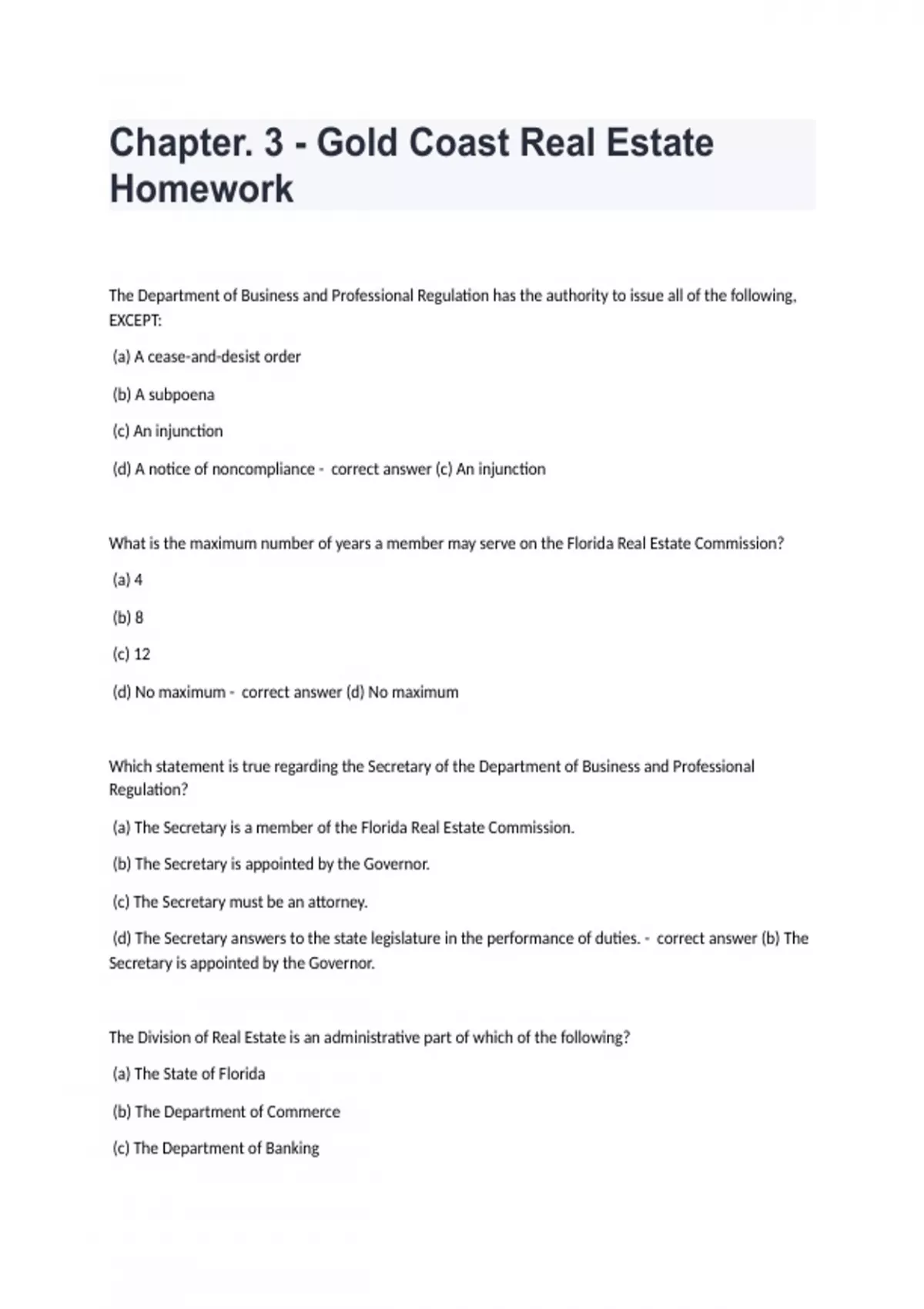 Chapter. 3 - Gold Coast Real Estate HomeworkThe Department of Business and Professional Regulation has the authority to issue all of the following, EXCEPT: (a) A cease-and-desist order (b) A subpoena (c) An injunction (d) A notice of noncompliance - correct answer (c) An injunction What is the maximum number of years a member may serve on the Florida Real Estate Commission? (a) 4 (b) 8 (c) 12 (d) No maximum - correct answer (d) No maximum Which statement is true regarding the Secretary of the Department of Business and Professional Regulation? (a) The Secretary is a member of the Florida Real Estate Commission. (b) The Secretary is appointed by the Governor. (c) The Secretary must be an attorney. (d) The Secretary answers to the state legislature in the performance of duties. - correct answer (b) The Secretary is appointed by the Governor. The Division of Real Estate is an administrative part of which of the following? (a) The State of Florida (b) The Department of Commerce (c) The Department of Banking (d) The Department of Business and Professional Regulation - correct answer (d) The Department of Business and Professional Regulation Which statement is true regarding examination questions and answers? (a) They are published in the Administrative Weekly before appearing in an examination. (b) They may not be challenged. (c) They may be reviewed by any member of the public upon request. (d) They are confidential. - correct answer (d) They are confidential. Which of the following entities issues real estate licenses? (a) The State of Florida (b) The Department of Business and Professional Regulation (c) The Department of Revenue (d) The Florida Real Estate Commission - correct answer (b) The Department of Business and Professional Regulation After being active in the real estate business for over five years, a licensee's license expired on September 30. What is the status of the license on October 1? (a) Suspended (b) Revoked (c) Involuntary inactive (d) Voluntary inactive - correct answer (c) Involuntary inactive The Florida Real Estate Commission held a meeting for the purpose of passing a new rule. This is an exercise of which Commission power? (a) Executive (b) Quasi-legislative (c) Quasi-judicial (d) Ministerial - correct answer (b) Quasi-legislative Which of the following statements is true regarding the Director of the Division of Real Estate? (a) The Director is appointed by the Secretary of the Department of Business and Professional Regulation. (b) The Director is a member of the Florida Real Estate Commission. (c) The Director is not subject to confirmation or approval by the Florida Real Estate Commission. (d) The Director answers only to the Governor in the performance of his or her duties. - correct answer (a) The Director is appointed by the Secretary of the Department of Business and Professional Regulation. The Department of Business and Professional Regulation (DBPR) is created by which Florida statute? (a) F.S. 120 (b) F.S. 455 (c) F.S. 475 (d) F.S. 494 - correct answer (b) F.S. 455 If an applicant for a real estate license provides false information on their application, they commit which of the following criminal violations? (a) First-degree misdemeanor (b) Second-degree misdemeanor (c) Second-degree felony (d) Third-degree felony - correct answer (d) Third-degree felony What action may the Department take if it determines that an unlicensed person has operated in violation of a law or rule under its administration? (a) None, since the Department has no jurisdiction over unlicensed individuals. (b) It may issue an injunction prohibiting such activity in the future. (c) It may imprison the violator for up to 5 years. (d) An administrative fine of up to $5,000 may be imposed. - correct answer (d) An administrative fine of up to $5,000 may be imposed.