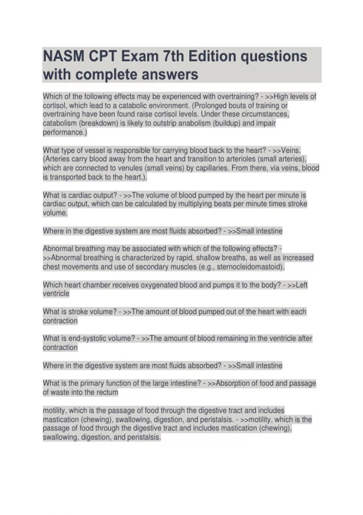 Which of the following effects may be experienced with overtraining? - High levels of cortisol, which lead to a catabolic environment. (Prolonged bouts of training or overtraining have been found raise cortisol levels. Under these circumstances, catabolism (breakdown) is likely to outstrip anabolism (buildup) and impair performance.) What type of vessel is responsible for carrying blood back to the heart? - Veins. (Arteries carry blood away from the heart and transition to arterioles (small arteries), which are connected to venules (small veins) by capillaries. From there, via veins, blood is transported back to the heart.). What is cardiac output? - The volume of blood pumped by the heart per minute is cardiac output, which can be calculated by multiplying beats per minute times stroke volume. Where in the digestive system are most fluids absorbed? - Small intestin