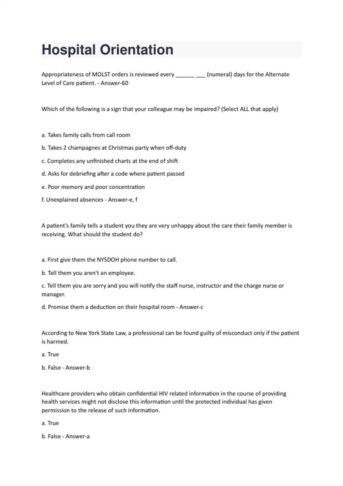 Appropriateness of MOLST orders is reviewed every ______ ___ (numeral) days for the Alternate Level of Care patient. - Answer-60 Which of the following is a sign that your colleague may be impaired? (Select ALL that apply) a. Takes family calls from call room b. Takes 2 champagnes at Christmas party when off-duty c. Completes any unfinished charts at the end of shift d. Asks for debriefing after a code where patient passed e. Poor memory and poor concentration f. Unexplained absences - Answer-e, f A patient's family tells a student you they are very unhappy about the care their family member is receiving. What should the student do? a. First give them the NYSDOH phone number to call. b. Tell them you aren't an employee. c. Tell them you are sorry and you will notify the staff nurse, instructor and the charge nurse or manager. d. Promise them a deduction on their hospital room - Answer-c According to New York State Law, a professional can be found guilty of misconduct only if the patient is harmed. a. True b. False - Answer-b Healthcare providers who obtain confidential HIV related information in the course of providing health services might not disclose this information until the protected individual has given permission to the release of such information. a. True b. False - Answer-aIn NYS a designated staff member reviews the patient's Bill of Rights with them at admission. The Rights include [select ALL that are correct] a. Receive treatment without discrimination as to sexual orientation b. Participate in decisions about the standards of care of the hospital c. Make known their wishes in regard to anatomical gifts d. Receive pain medications on a set schedule. - Answer-a, c, d