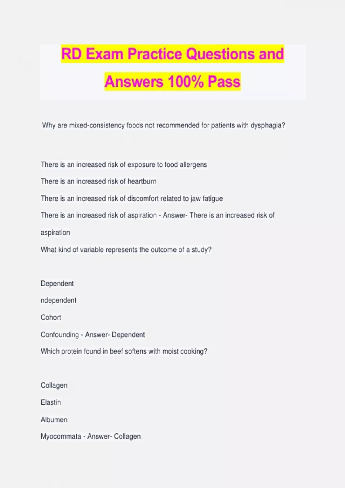 RD Exam Practice Questions and Answers 100% Pass Why are mixed-consistency foods not recommended for patients with dysphagia? There is an increased risk of exposure to food allergens There is an increased risk of heartburn There is an increased risk of discomfort related to jaw fatigue There is an increased risk of aspiration - Answer- There is an increased risk of aspiration What kind of variable represents the outcome of a study? Dependent ndependent Cohort Confounding - Answer- Dependent Which protein found in beef softens with moist cooking? Collagen Elastin Albumen Myocommata - Answer- Collagen Prioritization of nutrition interventions includes client preference, urgency, impact potential, and which of the following? Practice guidelines Available resources Insurance coverage Hospital protocols - Answer- Available resources What food is most likely to cause solanine poisoning? Deli meats Canned fish Soft cheeses Potatoes - Answer- Potatoes What is ozone used for in food processing? Freezing food Modifying atmospheric packaging Blanching vegetables Effectively disinfecting and sanitizing - Answer- Effectively disinfecting and sanitizing What is the hormone that lowers blood glucose? Glucocorticoids Glucagon Somatostatin Insulin - Answer- Insulin Which of the following is true of iron absorption? - Vegetables high in vitamin A enhance iron absorption - Tofu is not a recommended plant-based source of dietary iron - Heme iron is better absorbed than nonheme iron - Magnesium inhibits iron absorption from both heme and nonheme sources - Answer- Heme iron is better absorbed than nonheme iron This enzyme found in the kidney is needed for the conversion of 25-hydroxyvitamin D3 to the active form