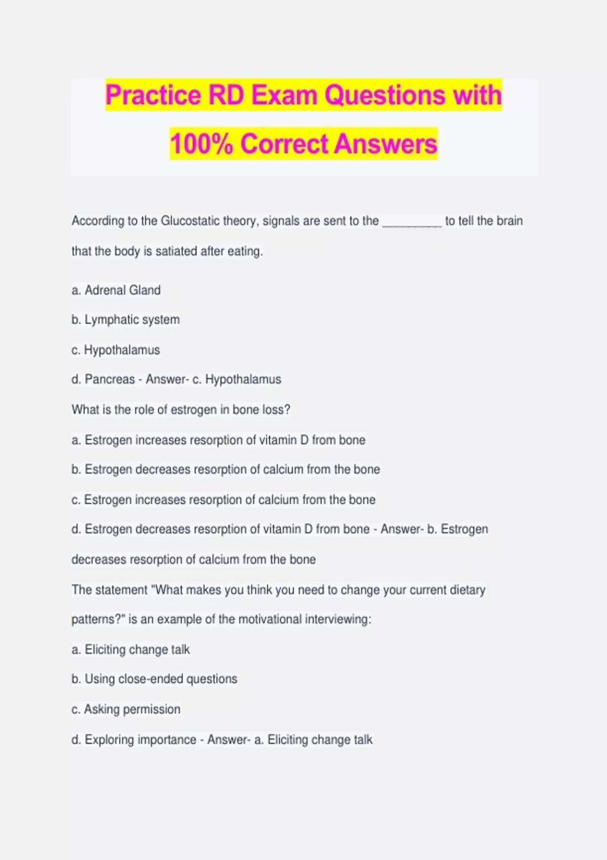 Practice RD Exam Questions with 100% Correct Answers According to the Glucostatic theory, signals are sent to the _________ to tell the brain that the body is satiated after eating. a. Adrenal Gland b. Lymphatic system c. Hypothalamus d. Pancreas - Answer- c. Hypothalamus What is the role of estrogen in bone loss? a. Estrogen increases resorption of vitamin D from bone b. Estrogen decreases resorption of calcium from the bone c. Estrogen increases resorption of calcium from the bone d. Estrogen decreases resorption of vitamin D from bone - Answer- b. Estrogen decreases resorption of calcium from the bone The statement "What makes you think you need to change your current dietary patterns?" is an example of the motivational interviewing: a. Eliciting change talk b. Using close-ended questions c. Asking permission d. Exploring importance - Answer- a. Eliciting change talk The statement, "Do you mind if we talk about your sugar levels from this past week?" is an example of motivational interviewing: a. Using close-ended questions b. Eliciting change talk c. Exploring importance d. Asking permission - Answer- d. Asking permission Which statement best describes the source and metabolism of heme iron? a. Heme iron is found in plant foods; it requires a reducing agent for absorption b. Heme iron is found in plant foods; it does not require a reducing agent for absorption c. Heme iron is found in meats and animal tissue; it requires a reducing agent for absorption d. Heme iron is found in meats and animal tissue; it does not require a reducing agent for absorption - Answer- d. Heme iron is found in meats and animal tissue; it does not require a reducing agent for absorption Which 2 nutrients interfere with calcium absorption? a. copper and boron b. zinc and iron c. iron and vitamin D d. zinc and boron - Answer- b. zinc and iron Red blood cells with a high color index are described as: a. hyperchromic b. hypocytic c. hypochromic d. hypercytic - Answer- a. Hyperchromic Which of the following nutrients adds or removes carbon dioxide from compounds during energy metabolism? a. Thiamin b. Biotin c. Pantothenic Acid d. Niacin - Answer- b. Biotin The statement, "Do you mind if we talk about your sodium intake?" is an example of the motivational interviewing strategy known as: a. Asking permission b. Eliciting change talk c. Using close-ended questions d. Exploring importance - Answer- a. Asking permission Which of the following is found in the husks of cereal grain and may inhibit calcium absorption? a. Iron b. Phytic acid c. Oxalic acid d. Zinc - Answer- b. Phytic acid Which of the following fibers gives a woody structure to plants and remains as long, tough strings in cooked vegetables? a. Cellulose b. Hemicellulose c. Pectin d. Lignin - Answer- Lignin The statement "Do you do any exercise" is an example of an: a. Open answer b. Closed question c. Open question d. Definitive answer - Answer- B. Closed question Which of the following molecules is mainly responsible for atherogenesis? a. LDL b. HDL c. Cholesterol transport protein d. Albumin - Answer- a. LDL The statement, "Most people rep