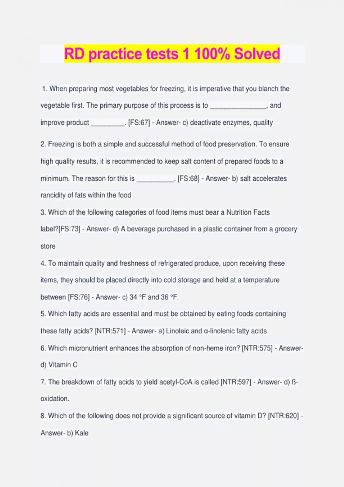 RD practice tests 1 100% Solved 1. When preparing most vegetables for freezing, it is imperative that you blanch the vegetable first. The primary purpose of this process is to _______________, and improve product _________. [FS:67] - Answer- c) deactivate enzymes, quality 2. Freezing is both a simple and successful method of food preservation. To ensure high quality results, it is recommended to keep salt content of prepared foods to a minimum. The reason for this is __________. [FS:68] - Answer- b) salt accelerates rancidity of fats within the food 3. Which of the following categories of food items must bear a Nutrition Facts label?[FS:73] - Answer- d) A beverage purchased in a plastic container from a grocery store 4. To maintain quality and freshness of refrigerated produce, upon receiving these items, they should be placed directly into cold storage and held at a temperature between [FS:76] - Answer- c) 34 °F and 36 °F. 5. Which fatty acids are essential and must be obtained by eating foods containing these fatty acids? [NTR:571] - Answer- a) Linoleic and α-linolenic fatty acids 6. Which micronutrient enhances the absorption of non-heme iron? [NTR:575] - Answer- d) Vitamin C 7. The breakdown of fatty acids to yield acetyl-CoA is called [NTR:597] - Answer- d) ß- oxidation. 8. Which of the following does not provide a significant source of vitamin D? [NTR:620] - Answer- b) Kale 9. Excessive intake of phytates and oxalates can interfere with the absorption of [NTR:643] - Answer- b) minerals 10. If the dietetic professional presents new information to an adult orally, about how much of what is heard will be remembered? - Answer- a) 20% 11. The dietetic professional has developed a weight-loss program that includes encouraging participants to reward themselves with treats such as new clothe, going to a movie or spending more time in a favorite past-time after they have lost 5 pounds. The learning theory being applied is ________ - Answer- a) behavioral 12. Which of the following is an example of a positive correlation? [NTR:592] - Answer- b) "The incidence of type 2 diabetes mellitus increases as central adiposity increases." 13. Guidelines to treat disorders of lipid metabolism in patients with diabetes include: [NTR:396] - Answer- a) 25-35% of total energy from fat; less than 7% of total energy from saturated and trans fat. 14. The DASH diet plan has been shown to be beneficial for which medical condition? [NTR:397] - Answer- b) Hypertension 15. The following micronutrients should be supplemented in a patient with history of alcoholism: [NTR:398] - Answer- a) thiamin and folic acid. 16. The most appropriate nutrition prescription for your patient with cirrhosis includes: [NTR:401] - Answer- c) 4-6 smaller meals per day