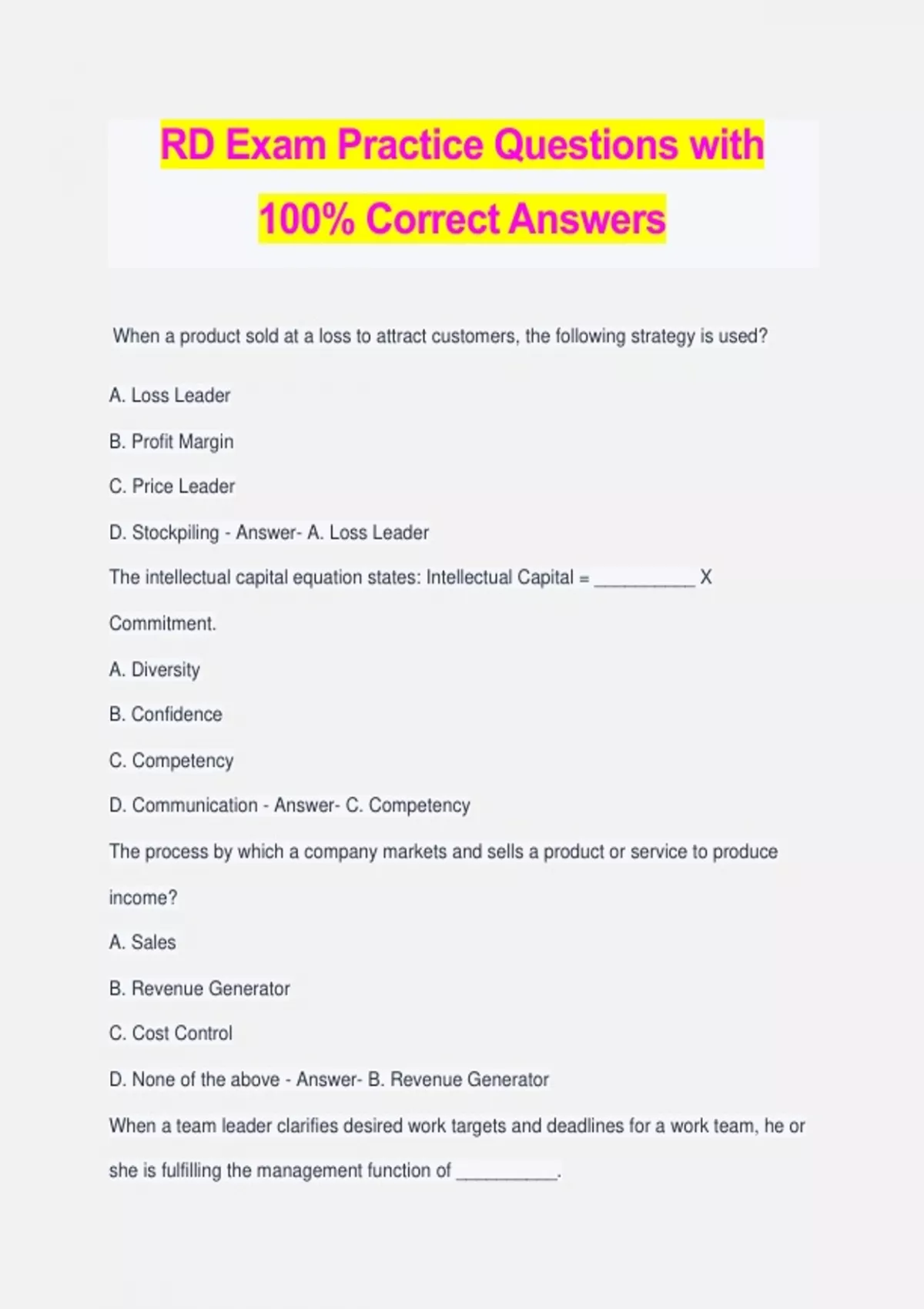 RD Exam Practice Questions with 100% Correct Answers When a product sold at a loss to attract customers, the following strategy is used? A. Loss Leader B. Profit Margin C. Price Leader D. Stockpiling - Answer- A. Loss Leader The intellectual capital equation states: Intellectual Capital = __________ X Commitment. A. Diversity B. Confidence C. Competency D. Communication - Answer- C. Competency The process by which a company markets and sells a product or service to produce income? A. Sales B. Revenue Generator C. Cost Control D. None of the above - Answer- B. Revenue Generator When a team leader clarifies desired work targets and deadlines for a work team, he or she is fulfilling the management function of __________. A. Planning B. Delegating C. Controlling D. Supervising - Answer- A. Planning One of the most important strategies a dietitian may use to evaluate quality patient care is to: A. Determine criteria for consultations B. Monitor treatment for a nutrition problem C. Periodically assess the outcomes of nutrition therapy D. Assign individuals responsibility for monitoring activities - Answer- C. Periodically assess the outcomes of nutrition therapy The method of budgeting that uses the information that uses the information from the previous year's budget and then makes adjustments based on changes in revenue and expenses is called: A. Level budgeting B. Incremental budgeting C. Zero-based budgeting D. Performance budgeting - Answer- B. Incremental budgeting The process of building and maintaining good working relationships with others who may some-day help a manager implement his or her work agendas is called __________________. A. Marketing Mix B. Campaign Development C. Networking D. Media Relations - Answer- C. Networking All of the following are included on a balance sheet EXCEPT: A. Assets such as cash on hand, petty cash, and accounts receivable B. Liabilities such as accounts payable, salaries, and sales tax owed C. Assets such as money due from state or federal funds and purchased food and supplies D. Liabilities such as equipment or furniture - Answer- D. Liabilities such as equipment or furniture Break-even point is the point where revenues equal the total of all expenses including the cost of goods sold. True OR False - Answer- True As a first step to help implement her firm's strategic plans, the CEO of a business firm would want marketing, manufacturing, and finance executives to develop clear and appropriate __________.