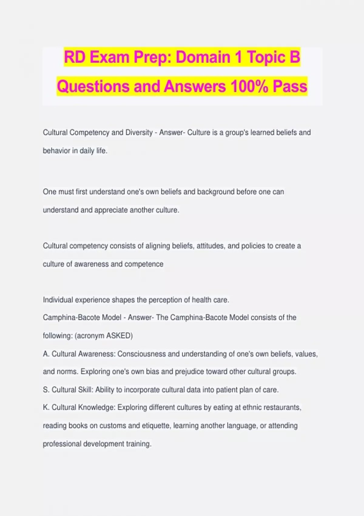 RD Exam Prep: Domain 1 Topic B Questions and Answers 100% Pass Cultural Competency and Diversity - Answer- Culture is a group's learned beliefs and behavior in daily life. One must first understand one's own beliefs and background before one can understand and appreciate another culture. Cultural competency consists of aligning beliefs, attitudes, and policies to create a culture of awareness and competence Individual experience shapes the perception of health care. Camphina-Bacote Model - Answer- The Camphina-Bacote Model consists of the following: (acronym ASKED) A. Cultural Awareness: Consciousness and understanding of one's own beliefs, values, and norms. Exploring one's own bias and prejudice toward other cultural groups. S. Cultural Skill: Ability to incorporate cultural data into patient plan of care. K. Cultural Knowledge: Exploring different cultures by eating at ethnic restaurants, reading books on customs and etiquette, learning another language, or attending professional development training. E. Cultural Encounters (Antecedent): Experiences with another culture that shapes one's perspective. D. Culture Desire: Wanting cultural competence, yet not competent Culturally Appropriate Strategies for Intervention - Answer- Explanatory Model: A culturally sensitive set of questions that provide insight into the most important aspect of a client's healthcare. LEARN Model: A framework that aims to elicit personal, social, and culturally relevant information to the problem. Helps to reduce communication barriers ETHNIC Model: Explanation, Treatment, Healers, Negotiation, Intervention, Collaboration CLAS Standards ( Addresses 15 mandates to eliminate health disparities, increase health equity, and improve the quality of services provided. Principal Standard 1. Provide effective, equitable, understandable, and respectful quality care and services that are responsive to diverse cultural health beliefs and practices, preferred languages, health literacy, and other communication needs. Governance, Leadership, and Workforce 2. Advance and sustain organizational governance and leadership that promotes CLAS and health equity through policy, practices, and allocated resources. 3. Recruit, promote, and support a culturally and linguistically diverse governance, leadership, and workforce that are responsive to the population in the service area. 4. Educate and train governance, leadership, and workforce in culturally and linguistically appropriate policies and practices on an ongoing basis. Communication and Language Assistance 5. Offer language assistance to individuals who have limited English proficiency and/or other communication needs, at no cost to them, to facilitate timely access to all health care and services. 6. Inform all individuals of the availability of language assistance services clearly and in their preferred language, verbally and in writing