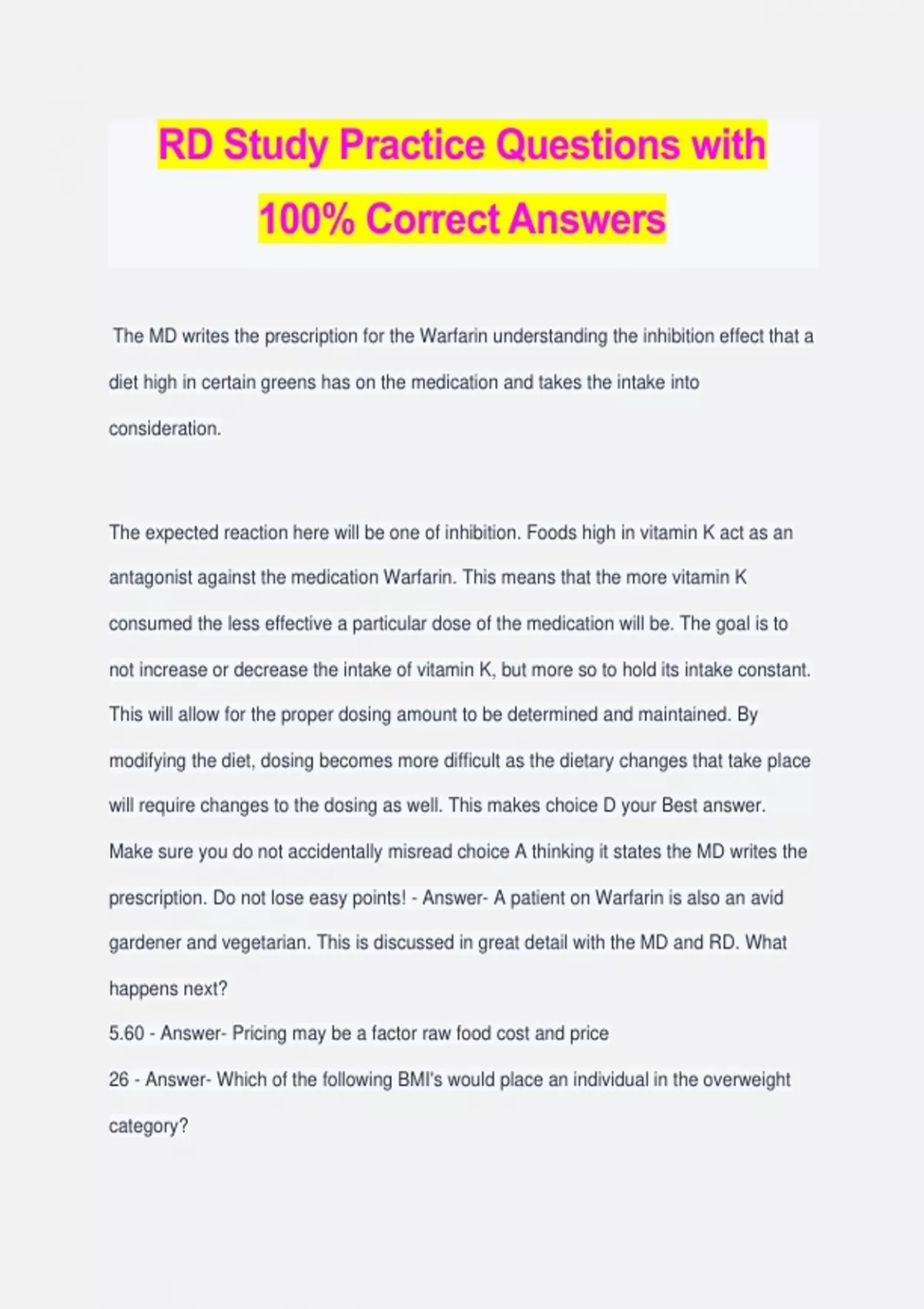 RD Study Practice Questions with 100% Correct Answers The MD writes the prescription for the Warfarin understanding the inhibition effect that a diet high in certain greens has on the medication and takes the intake into consideration. The expected reaction here will be one of inhibition. Foods high in vitamin K act as an antagonist against the medication Warfarin. This means that the more vitamin K consumed the less effective a particular dose of the medication will be. The goal is to not increase or decrease the intake of vitamin K, but more so to hold its intake constant. This will allow for the proper dosing amount to be determined and maintained. By modifying the diet, dosing becomes more difficult as the dietary changes that take place will require changes to the dosing as well. This makes choice D your Best answer. Make sure you do not accidentally misread choice A thinking it states the MD writes the prescription. Do not lose easy points! - Answer- A patient on Warfarin is also an avid gardener and vegetarian. This is discussed in great detail with the MD and RD. What happens next? 5.60 - Answer- Pricing may be a factor raw food cost and price 26 - Answer- Which of the following BMI's would place an individual in the overweight category? 3 weeks/ 1 week - Answer- Fresh uncooked eggs can last ________ in the refrigerator, while hard boiled eggs will last ____________. The Kidneys are no longer functioning and the person is on dialysis - Answer- A patient is no longer able to produce erythropoietin, nor is this individual able to produce calcitriol, although the production of cholecalciferol is unhindered. What could be the problem? glycosidic Peptide bonds are the type of bonds that join amino acids together, so this is NOT correct. Isoelectric or crystallization bonds are false terms and are here as distractor terms, meant to confuse you. Van Der Waals forces are very weak bonds formed by dipole interactions between molecules and are NOT forces that bond disaccharides. The bond that joins two simple sugars together to form a disaccharide, is the same bond type that holds all carbohydrate molecules together. It is called a glycosidic bond, and that is the BEST answer. To help you remember the bond types, glycol is the beginning of glycogen, the primary storage type of glucose within the body. Peptide begins with the letter P, the same as protein. - Answer- The type of bond joining two monosaccharides to make a disaccharide is called a(n) _________ bond. It includes fat free milk with all meals In 1995, USDA launched the SMI to improve the nutritional quality of school lunches and breakfasts. SMI nutrition standards require school meals to comply with the Dietary Guidelines for Americans for children over age 2. To meet USDA requirements for the SMI the average school meal which is analyzed weekly must: contain no more than 30 percent of calories from fat; contain no more than 10 percent of calories from saturated fat; and provide one-third of the Recommended Daily Allowances (RDAs) for protein, vitamin A, vitamin C, iron, calcium, and calories. Schools that participate must operate on a nonprofit basis. The SMI does NOT dictate that fat free milk is required to be served, making choice E the BEST answer. - Answer- Which of the following is NOT true when it comes to the School Meal Initiative (SMI) for Healthy Children? braising The conversion of collagen into gelatin requires liquid during the cooking process. The only wet method of cooking in this list is braising, making A your BEST answer. Braising is considered both a wet and dry method of cooking for the item is first seared and browned. Stock or liquid is then added, the temperature is reduced and the item is covered. Braising allows tough cuts of meat to be turned into delicious dishes by breaking down tough connective tissue. - Answer- Which of the following cooking methods is best for converting collagen into gelatin? the effect is highest with fat