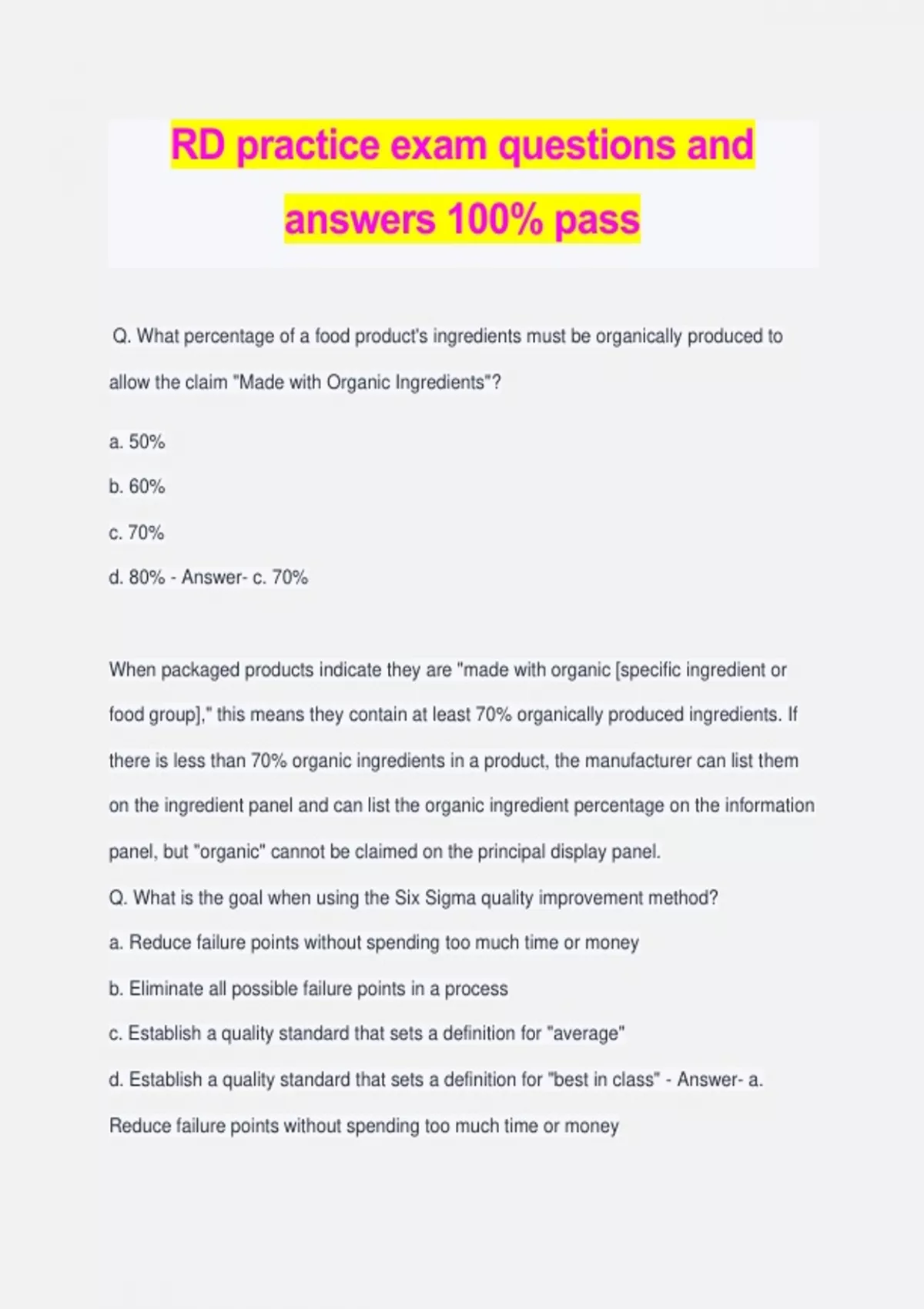 RD practice exam questions and answers 100% pass Q. What percentage of a food product's ingredients must be organically produced to allow the claim "Made with Organic Ingredients"? a. 50% b. 60% c. 70% d. 80% - Answer- c. 70% When packaged products indicate they are "made with organic [specific ingredient or food group]," this means they contain at least 70% organically produced ingredients. If there is less than 70% organic ingredients in a product, the manufacturer can list them on the ingredient panel and can list the organic ingredient percentage on the information panel, but "organic" cannot be claimed on the principal display panel. Q. What is the goal when using the Six Sigma quality improvement method? a. Reduce failure points without spending too much time or money b. Eliminate all possible failure points in a process c. Establish a quality standard that sets a definition for "average" d. Establish a quality standard that sets a definition for "best in class" - Answer- a. Reduce failure points without spending too much time or money The goal of Six Sigma is not to eliminate all failures of quality but rather reduce them until it is no longer cost-effective to pursue any further reduction. Q. Which of the following situations show that a manager is following the Kaizen process improvement method? a. The manager personally monitors the operations to identify opportunities b. The manager hires consultants to observe the operations to identify opportunities c. The manager engages employees at all levels to identify opportunities d. The manager examines operational data to identify opportunities - Answer- c. The manager engages employees at all levels to identify opportunities Kaizen is about building a culture where all employees are actively engaged in suggesting and implementing improvements. A manager who engages employees at all levels to identify opportunities is following the Kaizen methodology. Q. Which of the following characteristics is key to an efficient and effective system? a. Continuous response and adaptation to the system b. Flow of resources c. Interdependency of parts d. Achievement of subunit objectives - Answer- c. Interdependency of parts A system is a collection of interrelated parts or subsystems unified by design to obtain one or more objectives. Interdependency is the reciprocal relationship of the parts of a system; each part mutually affects the performance of the others. Interdependency emphasizes the importance of viewing the organization as a whole rather than as isolated parts. The other responses (ie, continuous response and adaptation to a system, flow of resources through a system, and achievement of subunit objectives) all are isolated parts of a system. Q. One advantage of using a crossover design over a parallel design is a. it requires a shorter study duration. b. a larger sample size is used. c. there is a reduction in variability. d. a washout period is not needed. - Answer- c. there is a reduction in variability. Crossover design includes a washout period and does not have to be a shorter study duration. The advantage to crossover design is that it uses the same subjects who serve as the control, thus receiving the same treatment, resulting in a reduction in variability. This reduction in variability allows for a smaller sample size. Q. Customer and employee satisfaction in the foodservice system are a. Control b. Transformation c. Input d. Output - Answer- d. Output The outputs are the goods and services that result from transforming the inputs of the system and express how objectives are achieved. Customer and employee satisfaction and financial accountability are desired outcomes in a foodservice system. Q. Which of the following must be true for a food to be labeled "low fat"? a. Contains less than 0.5 g fat per serving b. Contains no more than 3 g fat per serving c. Contains 25% less fat than the full-fat food d. Contains 1/3 fewer calories or 50% less fat than the full-fat food - Answer- b. Contains no more than 3 g fat per serving Following food labeling laws, to be identified as low in fat, a serving of food must contain less than 3 g fat. Q. What is considered the evidence for a nutrition diagnostic statement? a. Signs and symptoms b. Problem c. Etiology d. Intervention - Answer- a. Signs and symptoms Nutrition diagnostic statements are also known as PES, which stands for Problem, Etiology, Signs and Symptoms. The standard presentation of a PES statement is: [Problem] related to [Etiology] as evidenced by [Signs and Symptoms]. Q. What type of power is used when placing an employee on a performance improvement plan? a. Punitive b. Legal c. Expert d. Interpersonal - Answer- a. Punitive Placing an employee on a performance improvement plan, or PIP, is a form of punitive power. PIPs are typically implemented when an employee is not meeting specific job goals or demonstrates behaviors of concern to management. The PIP gives the employee the opportunity to address the deficiency and succeed. Q. What should family/caregiver be advised to do if a person with type 1 diabetes experiences a severe hypoglycemia event and is unconscious? a. Give three hard candies b. Administer insulin c. Give 4 oz fruit juice d. Administer glucagon - Answer- d. Administer glucagon Since the person is unconscious/unresponsive with severe hypoglycemia, glucagon should be administered as the first-line treatment. A glucagon injection will mobilize glucose from the liver to raise the blood sugar level. This treatment minimizes risk of choking. The family/caregivers should not hesitate to contact emergency services if glucagon is not available or if they do not know how to use it. Q. When the diet is adequate in protein, the body can synthesize niacin from which amino acid? a. Phenylalanine b. Valine c. Tyrosine d. Tryptophan - Answer- d. Tryptophan Tryptophan is an amino acid that is converted to niacin in the liver. An estimated 1 mg niacin is made from the ingesti