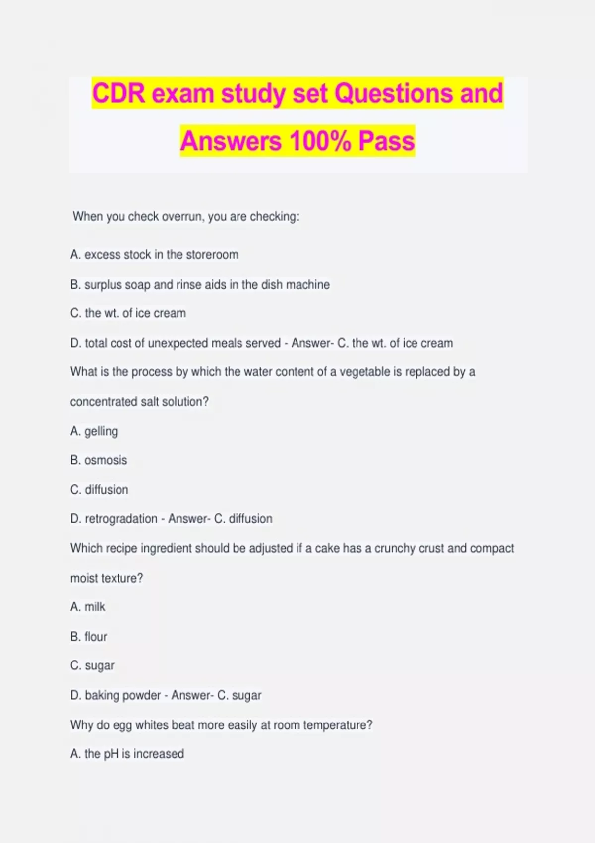 CDR exam study set Questions and Answers 100% Pass When you check overrun, you are checking: A. excess stock in the storeroom B. surplus soap and rinse aids in the dish machine C. the wt. of ice cream D. total cost of unexpected meals served - Answer- C. the wt. of ice cream What is the process by which the water content of a vegetable is replaced by a concentrated salt solution? A. gelling B. osmosis C. diffusion D. retrogradation - Answer- C. diffusion Which recipe ingredient should be adjusted if a cake has a crunchy crust and compact moist texture? A. milk B. flour C. sugar D. baking powder - Answer- C. sugar Why do egg whites beat more easily at room temperature? A. the pH is increased B. the protein is denatured C. the surface tension is lower D. the surface tension is higher - Answer- C. the surface tension is lower Which pigment does not change color in an acid or an alkaline solution? A. anthocyanin B. chlorophyll C. carotenoid D. flavones - Answer- C. carotenoid The end product of cellular oxidation are: A. water, carbon dioxide, energy B. carbon, hydrogen, nitrogen C. indigestible fiber, nitrogen D. monosaccharides, amino acids, energy - Answer- A. water, carbon dioxide, energy Carbohydrates listed in order of decreasing sweetness are: A. fructose, glucose, sucrose, sorbitol B. sucrose, glucose, fructose, sorbitol C. fructose, sucrose, glucose, sorbitol D. sorbitol, fructose, sucrose, glucose - Answer- C. fructose, sucrose, glucose, sorbitol The flakiness of pie crust depends on: A. type of fat B. oxidation of fat C. temperature of fat D. oven temperature - Answer- A. type of fat If the sole source of protein is gelatin, growth is inhibited because: A. gelatin has no tryptophan and is low in methionine and lysine B. gelatin has no methionine and is low in tryptophan C. gelatin has no lysine or methionine, and is low in tryptophan D. gelatin has no arginine - Answer- A. gelatin has no tryptophan and is low in methionine and lysine A #10 can holds how many cups of product? A. 10 B. 13 C. 12 D. 5 - Answer- B. 13 If you replace half and half with whipping cream in ice cream, the effects on the ice crystals will be: A. an increase in size because theres less fat B. a decrease in size because theres more fat C. no change D. an increase in size because theres more fat - Answer- B. a decrease in size because theres more fat Fat produces more calories than carbohydrates because: A. fat has more carbon and hydrogen in relation to oxygen B. fat has less carbon and hydrogen in relation to oxygen C. fat is a larger molecule D. fat is a smaller molecule - Answer- A. fat has more carbon and hydrogen in relation to oxygen Research has shown that the risk for neural tube defects is lowered by taking supplements of: A. iron B. folic acid C. glutamine D. arginine - Answer- B. folic acid The best lab value to use in assessing iron status is: A. hemoglobin B. hematocrit C. ferritin D. serum iron - Answer- C. ferritin