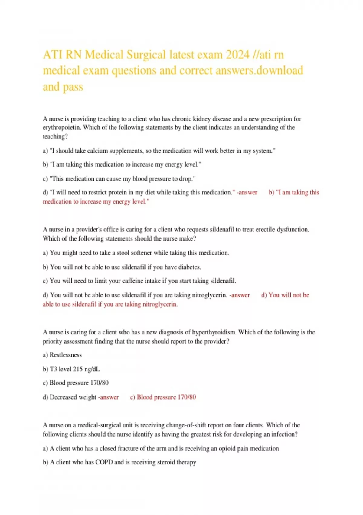 ATI RN Medical Surgical latest exam 2024 //ati rn medical exam questions and correct oad and pass A nurse is providing teaching to a client who has chronic kidney disease and a new prescription for erythropoietin. Which of the following statements by the client indicates an understanding of the teaching? a) "I should take calcium supplements, so the medication will work better in my system." b) "I am taking this medication to increase my energy level." c) "This medication can cause my blood pressure to drop." d) "I will need to restrict protein in my diet while taking this medication." -answer b) "I am taking this medication to increase my energy level." A nurse in a provider's office is caring for a client who requests sildenafil to treat erectile dysfunction. Which of the following statements should the nurse make? a) You might need to take a stool softener while taking this medication. b) You will not be able to use sildenafil if you have diabetes. c) You will need to limit your caffeine intake if you start taking sildenafil. d) You will not be able to use sildenafil if you are taking nitroglycerin. -answer d) You will not be able to use sildenafil if you are taking nitroglycerin. A nurse is caring for a client who has a new diagnosis of hyperthyroidism. Which of the following is the priority assessment finding that the nurse should report to the provider? a) Restlessness b) T3 level 215 ng/dL c) Blood pressure 170/80 d) Decreased weight -answer c) Blood pressure 170/80 A nurse on a medical-surgical unit is receiving change-of-shift report on four clients. Which of the following clients should the nurse identify as having the greatest risk for developing an infection? a) A client who has a closed fracture of the arm and is receiving an opioid pain medication b) A client who has COPD and is receiving steroid therapy c) A client who is postoperative following a laparoscopic appendectomy and is receiving an antibiotic d) A client who has a deep vein thrombosis (DVT) and is receiving anticoagulant therapy -answer b) A client who has COPD and is receiving steroid therapy A nurse in an emergency department is assessing an older adult client who has a fractured wrist following a fall. During the assessment, the client states, "Last week I crashed my car because my vision suddenly went blurry." Which of the following actions is the nurse's priority? a) Check the client's neurological status b) Document the client's statements c) Prepare the client for a CT scan d) Teach the client about using safety precautions for falls -answer a) Check the client's neurological status A nurse is providing preoperative teaching for a client who is scheduled for an open cholecystectomy. Which of the following actions should the nurse take? a) Teach the importance of a clear liquid diet after discharge b) Tell the client to remove incisional adhesive strips 3 days after discharge c) Demonstrate ways to deep breath and cough d) Instruct the client to maintain bedrest for 48 hours -answer c) Demonstrate ways to deep breath and cough A nurse in an emergency department is caring for a client who has full-thickness burns over 20% of his total body surface area. After ensuring a patent airway and administering oxygen, which of the following items should the nurse prepare to administer? a) IV fluids b) Analgesia c) Antibiotics d) Tetanus toxoid -answer a) IV fluids A nurse in a provider's office is assessing a client who has migraine headaches and is taking feverfew to prevent her headaches. The nurse should identify that which of the following client medications interacts with feverfew? a) Metoprolol b) Bupropion c) Naproxen d) Atorvastatin -answer c) Naproxen A nurse is providing discharge teaching to a client who has laryngeal cancer and is receiving radiation treatment. Which of the following statements made by the client indicates an understanding of the teaching? a) I will wear a badge to measure how much radiation I am receiving b) I will remove the markings on the skin after each radiation treatment c) I will avoid direct exposure to the sun d) I will rinse my mouth with a commercial mouthwash -answer c) I will avoid direct exposure to the sun A nurse is preparing to administer a blood transfusion to a client who has anemia. Which of the following actions should the nurse take first? a) Obtain the client's vital signs b) Describe the blood transfusion procedure to the client c) Check for the type and number of units of blood to administer d) Initiate a peripheral IV -answer c) Check for the type and number of units of blood to administer A nurse is caring for a client who has a prescription for enalapril. The nurse should identify which of the following findings as an adverse effect of the medication? a) Bradycardia b) Tremors c) Orthostatic hypotension d) Drowsiness -answer c) Orthostatic hypotension A nurse is assessing for compartment syndrome in a client who has a short leg cast. Which of the following findings should the nurse identify as a manifestation of this condition? a) Bounding pedal pulse b) Capillary refill less than 2 seconds c) Pain that increases with passive movement d) Areas of warmth on the cast -answer c) Pain that increases with passive movemen