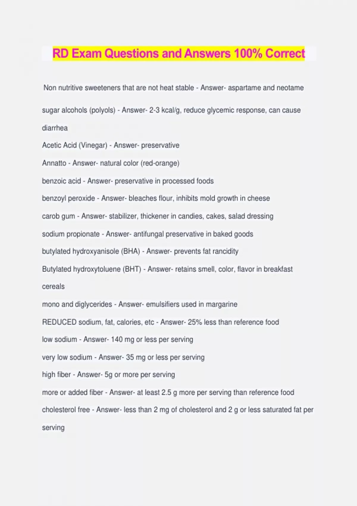 RD Exam Questions and Answers 100% Correct Non nutritive sweeteners that are not heat stable - Answer- aspartame and neotame sugar alcohols (polyols) - Answer- 2-3 kcal/g, reduce glycemic response, can cause diarrhea Acetic Acid (Vinegar) - Answer- preservative Annatto - Answer- natural color (red-orange) benzoic acid - Answer- preservative in processed foods benzoyl peroxide - Answer- bleaches flour, inhibits mold growth in cheese carob gum - Answer- stabilizer, thickener in candies, cakes, salad dressing sodium propionate - Answer- antifungal preservative in baked goods butylated hydroxyanisole (BHA) - Answer- prevents fat rancidity Butylated hydroxytoluene (BHT) - Answer- retains smell, color, flavor in breakfast cereals mono and diglycerides - Answer- emulsifiers used in margarine REDUCED sodium, fat, calories, etc - Answer- 25% less than reference food low sodium - Answer- 140 mg or less per serving very low sodium - Answer- 35 mg or less per serving high fiber - Answer- 5g or more per serving more or added fiber - Answer- at least 2.5 g more per serving than reference food cholesterol free - Answer- less than 2 mg of cholesterol and 2 g or less saturated fat per serving low cholesterol - Answer- 20 milligrams or less cholesterol per serving and 2 grams or less saturated fat and trans fat combined per serving low fat - Answer- 3 grams or less of fat per serving fat free, sugar free - Answer- less than 1/2 gram of fat or sugar per serving low calorie - Answer- 40 calories or less per serving More, added, extra, or plus - Answer- A serving of the food provides 10% of the DV. Can only be used to describe vitamins, minerals, protein, fiber and potassium good source of, contains, or provides - Answer- 10-19% of the DV per reference amount; may NOT be used for carbs high in, rich in, or excellent source of - Answer- The food contains 20 percent or more of DV, may NOT be used for carbs Amylase breaks down - Answer- starches Lingual lipase breaks down - Answer- triglycerides pepsin breaks down - Answer- proteins gastric lipase breaks down - Answer- triglycerides trypsin breaks down - Answer- proteins, polypeptides Chymotrypsin breaks down - Answer- proteins, peptides Carboxypeptidase breaks down - Answer- polypeptides elastase breaks down - Answer- elastin Lipase breaks down - Answer- fats cholesterol esterase breaks down - Answer- sterols Enterokinase breaks down - Answer- trypsinogen AMDR for carbs, children through adult - Answer- 45-65% AMDR for protein in children 1-3 - Answer- 5-20% AMDR for protein in children 4-18 - Answer- 10-30% AMDR for protein in adults - Answer- 10-35% AMDR for fat in children 1-3 - Answer- 30-40% AMDR for fat in children 4-18 - Answer- 25-35% AMDR for fat in adults - Answer- 20-35% AMDR for Omega 3 - Answer- 0.6-1.2% AMDR for omega 6 - Answer- 5-10% Recommended weight gain during pregnancy for BMI 18.5-24.9 - Answer- 25-35lb Recommended weight gain during pregnancy for BMI 25-29.9 - Answer- 15-25lb Low pre-pregnancy weight risks - Answer- SGA, low birth wt, trouble with feeding and latching, trouble gaining wt, infection, developmental delays