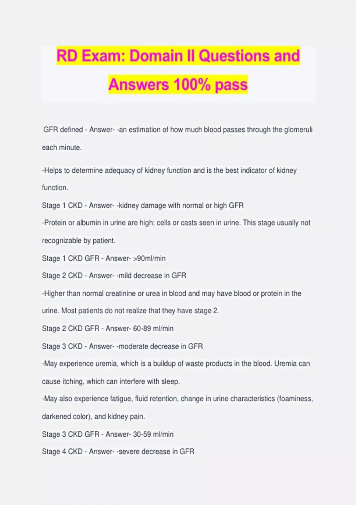 RD Exam: Domain II Questions and Answers 100% pass GFR defined - Answer- -an estimation of how much blood passes through the glomeruli each minute. -Helps to determine adequacy of kidney function and is the best indicator of kidney function. Stage 1 CKD - Answer- -kidney damage with normal or high GFR -Protein or albumin in urine are high; cells or casts seen in urine. This stage usually not recognizable by patient. Stage 1 CKD GFR - Answer- >90ml/min Stage 2 CKD - Answer- -mild decrease in GFR -Higher than normal creatinine or urea in blood and may have blood or protein in the urine. Most patients do not realize that they have stage 2. Stage 2 CKD GFR - Answer- 60-89 ml/min Stage 3 CKD - Answer- -moderate decrease in GFR -May experience uremia, which is a buildup of waste products in the blood. Uremia can cause itching, which can interfere with sleep. -May also experience fatigue, fluid retention, change in urine characteristics (foaminess, darkened color), and kidney pain. Stage 3 CKD GFR - Answer- 30-59 ml/min Stage 4 CKD - Answer- -severe decrease in GFR -Symptoms as seen in stage 3, but also taste changes, smell of uremia in breath, nausea, restless legs while sleeping, tingling in extremities. -May need dialysis. Stage 4 CKD GFR - Answer- 15-29 ml/min Stage 5 CKD - Answer- -kidney failure -End Stage Renal Disease -Will need dialysis Stage 5 CKD GFR - Answer- <15 ml/min Peritoneal dialysis - Answer- performed by running dialysate solution through the catheter into the peritoneum and then removing the solution after a time period and replacing it with new dialysate. Supplemental Nutrition Assistance Program - Answer- -Provides funds, in the form of a debit card, to eligible households to purchase food at authorized retailers. -Does not allow funds to be used to purchase alcohol, tobacco, pet foods, paper products, vitamins or hot foods. -Is the largest federally funded nutrition assistance program. Supplemental Nutrition Assistance Program Education - Answer- Provides education to SNAP participants on nutrition, physical activity and using food dollars wisely. Special Supplemental Nutrition Program for Women, Infants and Children - Answer- - WIC -Provides supplemental foods, nutrition education, screening (hematocrit, hemoglobin, height, weight, head circumference) and referrals to health care, at no cost. -Is available
