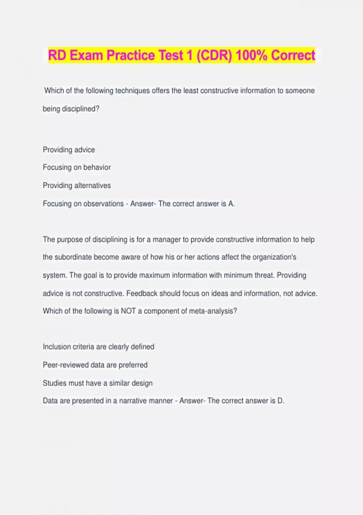 RD Exam Practice Test 1 (CDR) 100% Correct Which of the following techniques offers the least constructive information to someone being disciplined? Providing advice Focusing on behavior Providing alternatives Focusing on observations - Answer- The correct answer is A. The purpose of disciplining is for a manager to provide constructive information to help the subordinate become aware of how his or her actions affect the organization's system. The goal is to provide maximum information with minimum threat. Providing advice is not constructive. Feedback should focus on ideas and information, not advice. Which of the following is NOT a component of meta-analysis? Inclusion criteria are clearly defined Peer-reviewed data are preferred Studies must have a similar design Data are presented in a narrative manner - Answer- The correct answer is D. Meta-analysis uses studies with similar design, defines inclusion criteria, and usually uses peer-reviewed articles. There is no criterion or requirement that data have to be presented in a narrative manner. What elements comprise the marketing mix? Product, price, promotion, and place Price, product, popularity, and process Product, promotion, position, and popularity Product, place, position, and process - Answer- The correct answer is A. Marketing mix is a combination of product, price, place and promotion to achieve an organization's objectives and to satisfy the target market. A product can be a good, a service, or an idea. Price is the amount of money charged for a product. Promotion is used to facilitate exchanges by informing prospective customers about a business and its products. Place refers to the location, the place where the product is offered. The terms "popularity," "process," and "position" have no relevance in marketing mix. Which agency approves the use of food additives in breakfast cereal? US Department of Agriculture (USDA) Environmental Protection Agency (EPA) Food and Drug Administration (FDA) Federal Trade Commission (FTC) - Answer- The correct answer is C. The FDA regulates use of food additives—including coloring agents considered safe for human consumption and additives that are considered safe for human consumption or generally recognized as safe (GRAS) by the scientific community. Any food that contains a food additive that is not deemed safe is considered an adulterated food by FDA standards. Which of the following characteristics is key to an efficient and effective system? Continuous response and adaptation to the system Flow of resources Interdependency of parts Achievement of subunit objectives - Answer- The correct answer is C. A system is a collection of interrelated parts or subsystems unified by design to obtain one or more objectives. Interdependency is the reciprocal relationship of the parts of a system; each part mutually affects the performance of the others. Interdependency emphasizes the importance of viewing the organization as a whole rather than as isolated parts. The other responses (ie, continuous response and adaptation to a system, flow of resources through a system, and achievement of subunit objectives) all are isolated parts of a system. One advantage of using a crossover design over a parallel design is a shorter study duration. a smaller sample size