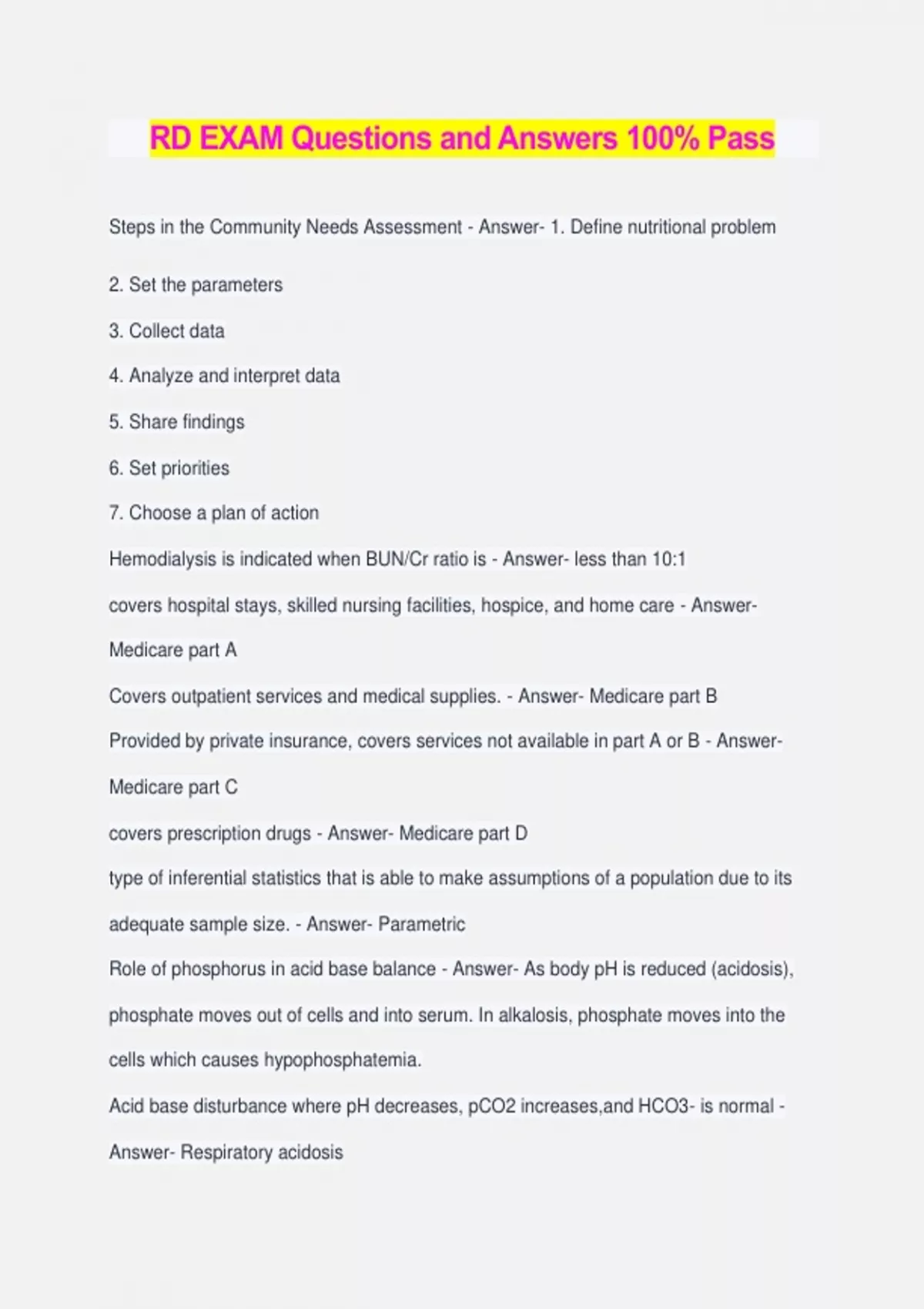 RD EXAM Questions and Answers 100% Pass Steps in the Community Needs Assessment - Answer- 1. Define nutritional problem 2. Set the parameters 3. Collect data 4. Analyze and interpret data 5. Share findings 6. Set priorities 7. Choose a plan of action Hemodialysis is indicated when BUN/Cr ratio is - Answer- less than 10:1 covers hospital stays, skilled nursing facilities, hospice, and home care - Answer- Medicare part A Covers outpatient services and medical supplies. - Answer- Medicare part B Provided by private insurance, covers services not available in part A or B - Answer- Medicare part C covers prescription drugs - Answer- Medicare part D type of inferential statistics that is able to make assumptions of a population due to its adequate sample size. - Answer- Parametric Role of phosphorus in acid base balance - Answer- As body pH is reduced (acidosis), phosphate moves out of cells and into serum. In alkalosis, phosphate moves into the cells which causes hypophosphatemia. Acid base disturbance where pH decreases, pCO2 increases,and HCO3- is normal - Answer- Respiratory acidosis Acid base disturbance where pH increases, pCO2 decreases, and HCO3- is normal - Answer- Respiratory alkalosis Acid base disturbance where pH decreases, pCO2 is normal, and HCO3- decreases - Answer- Metabolic acidosis Acid base disturbance where pH increases, pCO2 is normal, and HCO3- increases - Answer- Metabolic alkalosis In compensated respiratory acidosis - Answer- kidneys increase acid excretion and reabsorb bicarbonate, pCO2 and HCO3- increase In compensated respiratory alkalosis - Answer- Kidneys decrease acid excretion and reduce bicarb reabsorption, pCO2 and HCO3- decrease In compensated metabolic acidosis - Answer- lungs expire more CO2 (increase ventilation), pCO2 and HCO3- decrease In compensated metabolic alkalosis - Answer- lungs expire less CO2 (decrease ventilation), pCO2 and HCO3- increase Minerals used in acid base balance - Answer- sodium, potassium, chloride, phosphorus A child who plots between ___ and ___ BMI for age is considered to be at a normal weight - Answer- 6% and 84%