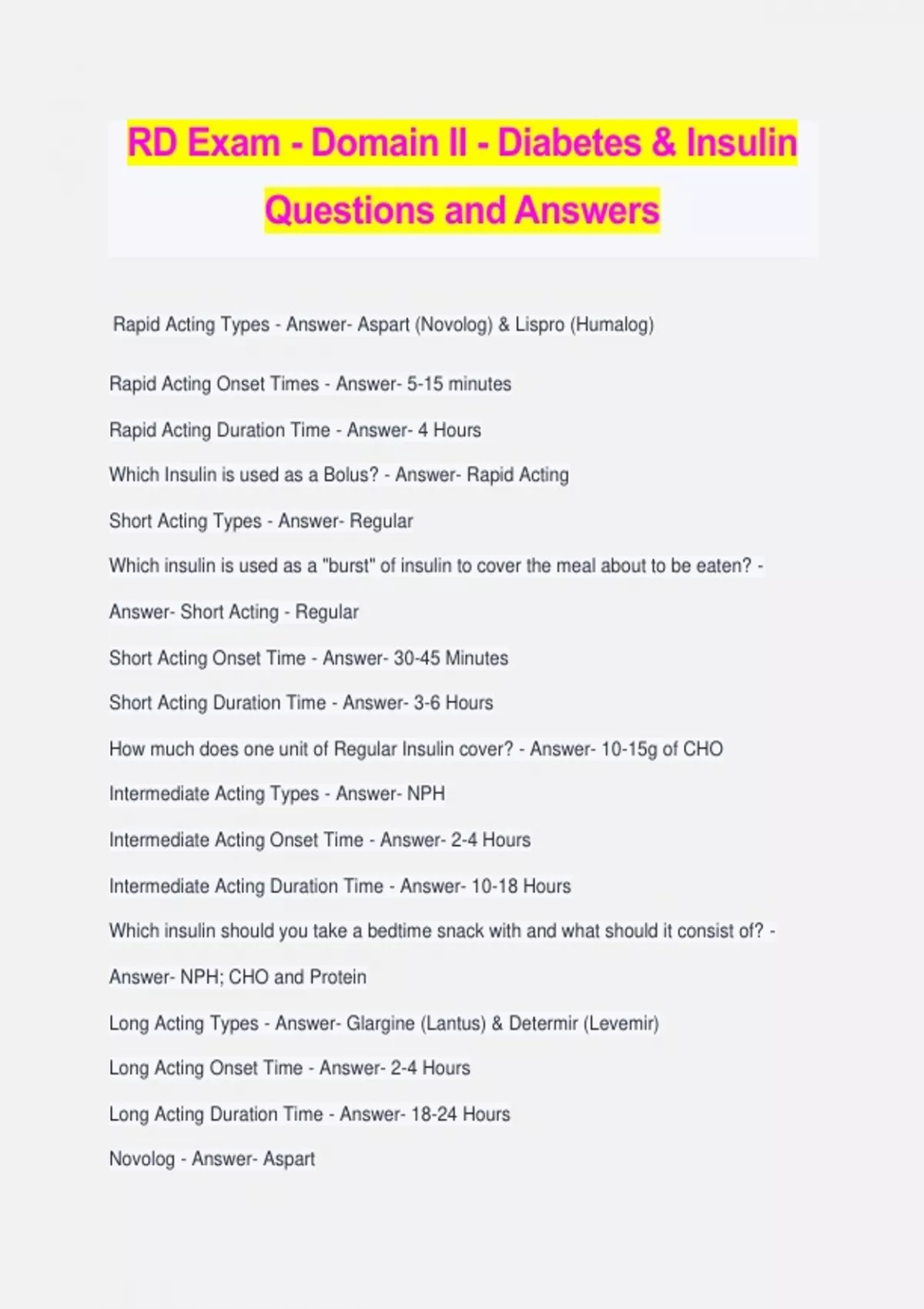 RD Exam - Domain II - Diabetes & Insulin Questions and Answers Rapid Acting Types - Answer- Aspart (Novolog) & Lispro (Humalog) Rapid Acting Onset Times - Answer- 5-15 minutes Rapid Acting Duration Time - Answer- 4 Hours Which Insulin is used as a Bolus? - Answer- Rapid Acting Short Acting Types - Answer- Regular Which insulin is used as a "burst" of insulin to cover the meal about to be eaten? - Answer- Short Acting - Regular Short Acting Onset Time - Answer- 30-45 Minutes Short Acting Duration Time - Answer- 3-6 Hours How much does one unit of Regular Insulin cover? - Answer- 10-15g of CHO Intermediate Acting Types - Answer- NPH Intermediate Acting Onset Time - Answer- 2-4 Hours Intermediate Acting Duration Time - Answer- 10-18 Hours Which insulin should you take a bedtime snack with and what should it consist of? - Answer- NPH; CHO and Protein