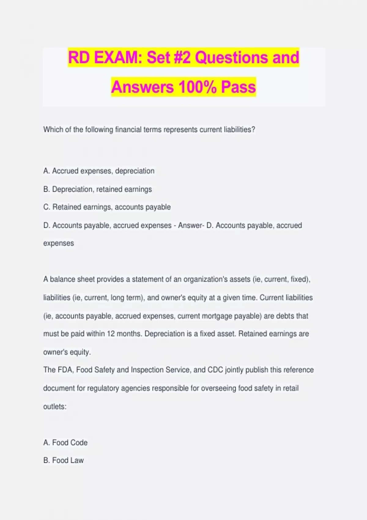 RD EXAM: Set #2 Questions and Answers 100% Pass Which of the following financial terms represents current liabilities? A. Accrued expenses, depreciation B. Depreciation, retained earnings C. Retained earnings, accounts payable D. Accounts payable, accrued expenses - Answer- D. Accounts payable, accrued expenses A balance sheet provides a statement of an organization's assets (ie, current, fixed), liabilities (ie, current, long term), and owner's equity at a given time. Current liabilities (ie, accounts payable, accrued expenses, current mortgage payable) are debts that must be paid within 12 months. Depreciation is a fixed asset. Retained earnings are owner's equity. The FDA, Food Safety and Inspection Service, and CDC jointly publish this reference document for regulatory agencies responsible for overseeing food safety in retail outlets: A. Food Code B. Food Law C. FoodNet D. Food Regulations - Answer- A. Food Code Every four years, these regulatory agencies release the Food Code. Anthocyanin in turnips may change to a blue-black or red-brown color if heated excessively in which type of pan? A. Cast iron B. Stainless steel C. Porcelain D. Aluminum - Answer- A. Cast iron Anthocyanin is a water-soluble red to blue pigment. Metals such as cast iron, tin, and sometimes aluminum will turn the anthocyanin pigment to various shades of blue. Therefore, use stainless steel or heat-safe glass for cooking anthocyanin vegetables and fruits and store them in stainless steel or glass containers. What are the estimated kilocalorie needs of a 4-month-old infant who weighs 14 pounds? A. 509 B. 623 C. 687 D. 724 - Answer- C. 687 Energy needs are calculated as 108 kcal/kg for infants 6 months of age and younger. For a 14 pound (6.36 kg) infant, 687 kcal is the estimated caloric requirement. When cooking fish, it should reach an internal temperature of: A. 135°F for 15 seconds. B. 145°F for 15 seconds. C. 155°F for 15 seconds. D. 165°F for 15 seconds. - Answer- B. 145 for 15 seconds The minimum internal temperature to ensure safety for consuming fish is 145°F. A foodservice operation has a 1.93 current ratio. This value indicates to creditors that the foodservice operation most likely will A. not be able to meet long-term financial obligations. B. not be able to generate profit in relation to sales. C. be able to control expenses. D. be able to pay bills when due. - Answer- D. Be able to pay bills when due Current ratio is calculated by dividing current assets by current liabilities. The resulting number indicates an organization's ability to meet current financial obligations, and therefore, is a measure of bill-paying ability. Creditors use the current ratio to help determine if an organization has sufficient assets to repay debts over the next 12 months. Current ratios >1 indicate the organization most likely will be able to pay bills when due and over the next 12 months. This emulsifier is manufactured by splitting a fatty acid off triacylglycerol molecules and is useful in frozen desserts, shortening, and margarine. A. Lecithin B. EDTA (ethylenediaminetetraacetic acid) C. Diglycerides D. Glycerol - Answer- C. Diglycerides
