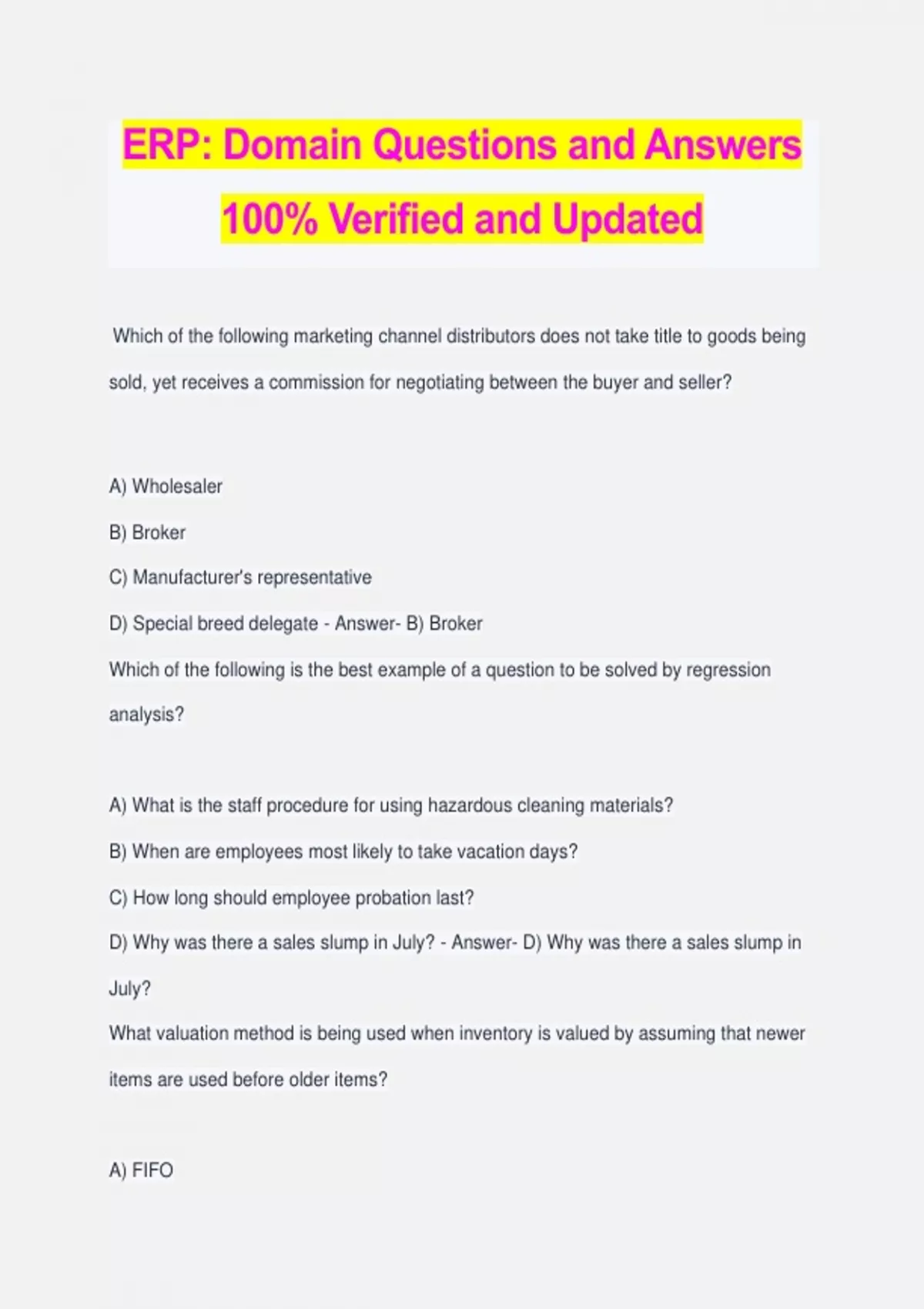 ERP: Domain Questions and Answers 100% Verified and Updated Which of the following marketing channel distributors does not take title to goods being sold, yet receives a commission for negotiating between the buyer and seller? A) Wholesaler B) Broker C) Manufacturer's representative D) Special breed delegate - Answer- B) Broker Which of the following is the best example of a question to be solved by regression analysis? A) What is the staff procedure for using hazardous cleaning materials? B) When are employees most likely to take vacation days? C) How long should employee probation last? D) Why was there a sales slump in July? - Answer- D) Why was there a sales slump in July? What valuation method is being used when inventory is valued by assuming that newer items are used before older items? A) FIFO B) LIFO C) Latest purchase price D) Weighted average - Answer- B) LIFO What name is given to the purchasing document that is completed by the buyer and given to the supplier? A) FOB origin B) Purchase requisition C) Invoice D) Purchase order - Answer- D) Purchase order This type of menu provides two or more choices for each category of food offered. A) Single-use menu B) Static menu C) Cycle menu D) Selective menu - Answer- D) Selective menu Which USDA grade of beef is not purchased for general foodservice use? A) Choice B) Select C) Standard D) Commercial - Answer- D) Commerical Which is the first document used in the purchasing process? A) Invoice B) Requisition C) Purchase order D) Inquisition - Answer- B) Requisition In the receiving process, what step should be taken first? A) Send items to be placed in storage B) Inspect items against purchase order C) Accept or reject the items D) Inspect items against invoice - Answer- B) Inspect items against purchase order The steps in receiving are as follows: 1. Inspect items against the purchase order 2. Inspect items against the invoice 3. Accept or reject order 4. Complete receiving records 5. Send items to storage. Which type of eggs should be served to patients in a nursing home? A) Freshly cracked sunny-side up B) Over easy C) Pasteurized scrambled eggs D) Pool cracked scrambled eggs - Answer- C) Pasteurized scrambled eggs Which of the following is a federal requirement for shelf-stable foods? A) All shelf-stable food products must include a sell-by date B) All shelf-stable food products must include both a sell-by and use-by date C) Product dating is encouraged but never required for shelf-stable foods D) Product dating is only required for infant formula - Answer- D) Product dating is only required for infant formula