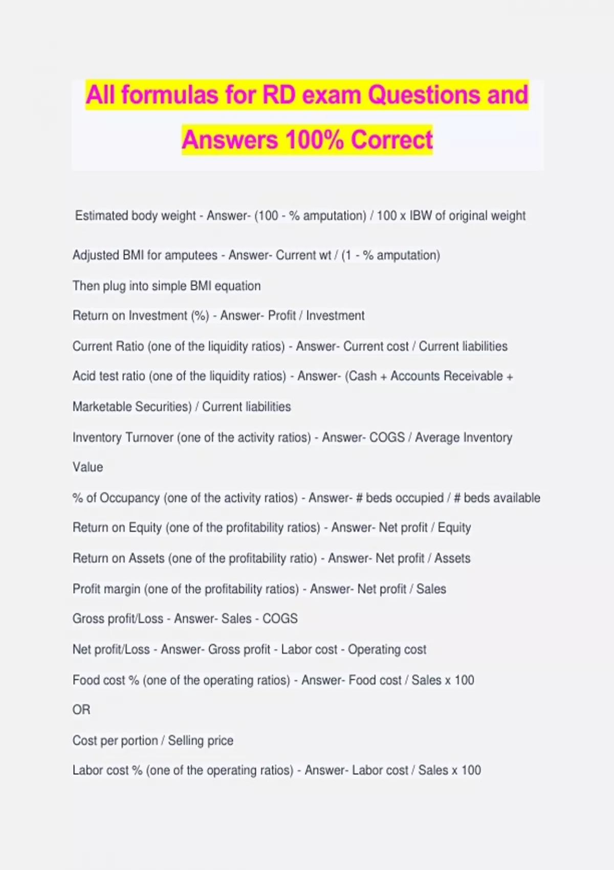 All formulas for RD exam Questions and Answers 100% Correct Estimated body weight - Answer- (100 - % amputation) / 100 x IBW of original weight Adjusted BMI for amputees - Answer- Current wt / (1 - % amputation) Then plug into simple BMI equation Return on Investment (%) - Answer- Profit / Investment Current Ratio (one of the liquidity ratios) - Answer- Current cost / Current liabilities Acid test ratio (one of the liquidity ratios) - Answer- (Cash + Accounts Receivable + Marketable Securities) / Current liabilities Inventory Turnover (one of the activity ratios) - Answer- COGS / Average Inventory Value % of Occupancy (one of the activity ratios) - Answer- # beds occupied / # beds available Return on Equity (one of the profitability ratios) - Answer- Net profit / Equity Return on Assets (one of the profitability ratio) - Answer- Net profit / Assets Profit margin (one of the profitability ratios) - Answer- Net profit / Sales Gross profit/Loss - Answer- Sales - COGS Net profit/Loss - Answer- Gross profit - Labor cost - Operating cost Food cost % (one of the operating ratios) - Answer- Food cost / Sales x 100 OR Cost per portion / Selling price Labor cost % (one of the operating ratios) - Answer- Labor cost / Sales x 100