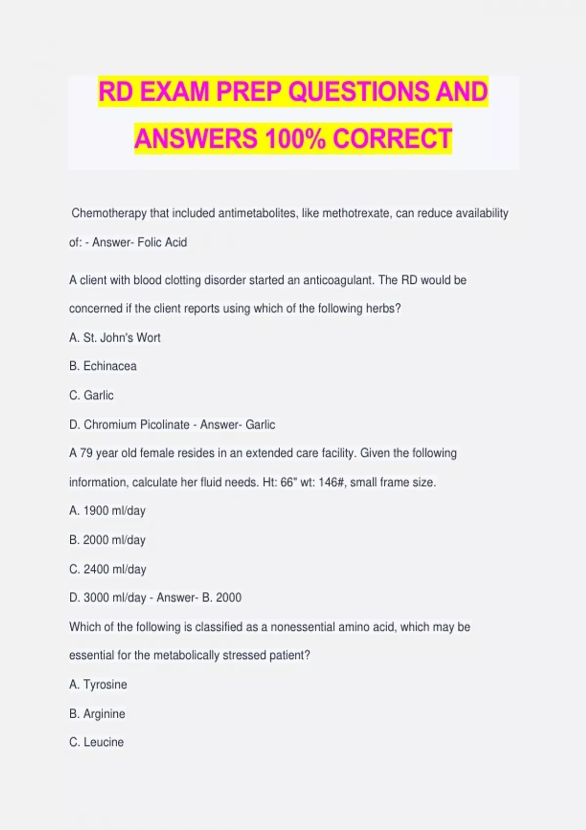 RD EXAM PREP QUESTIONS AND ANSWERS 100% CORRECT Chemotherapy that included antimetabolites, like methotrexate, can reduce availability of: - Answer- Folic Acid A client with blood clotting disorder started an anticoagulant. The RD would be concerned if the client reports using which of the following herbs? A. St. John's Wort B. Echinacea C. Garlic D. Chromium Picolinate - Answer- Garlic A 79 year old female resides in an extended care facility. Given the following information, calculate her fluid needs. Ht: 66" wt: 146#, small frame size. A. 1900 ml/day B. 2000 ml/day C. 2400 ml/day D. 3000 ml/day - Answer- B. 2000 Which of the following is classified as a nonessential amino acid, which may be essential for the metabolically stressed patient? A. Tyrosine B. Arginine C. Leucine D. Lysine - Answer- B.Arginine (only nonessential A.A. are Tyrosine and arginine) A severely malnourished patient receives TPN at a rate of 125 cc/hr. What could result? A. Hyperphosphatemia B. Hypermagnesemia C. Hypophosphatemia D. Hyponatremia - Answer- C. Hypophosphatemia The management of a burn pt includes the following nonprotein kilocalorie: nitrogen ratio. A. 300:1 B. 250:1 C. 200:1 D. 150:1 - Answer- D. A patient has been admitted to the hospital following a CVA, and the RD is informed that a swallowing evaluation indicates that the patient has dysphagia. The RD's first step should be: A. interview the patient's family to find out if there were any swallowing difficulties or eating problems prior to admission B. recommend a level 1 Pureed Dysphagia diet to be advanced as tolerated C. review the results and recommendations of the swallowing evaluation to determine the degree of dysphagia present