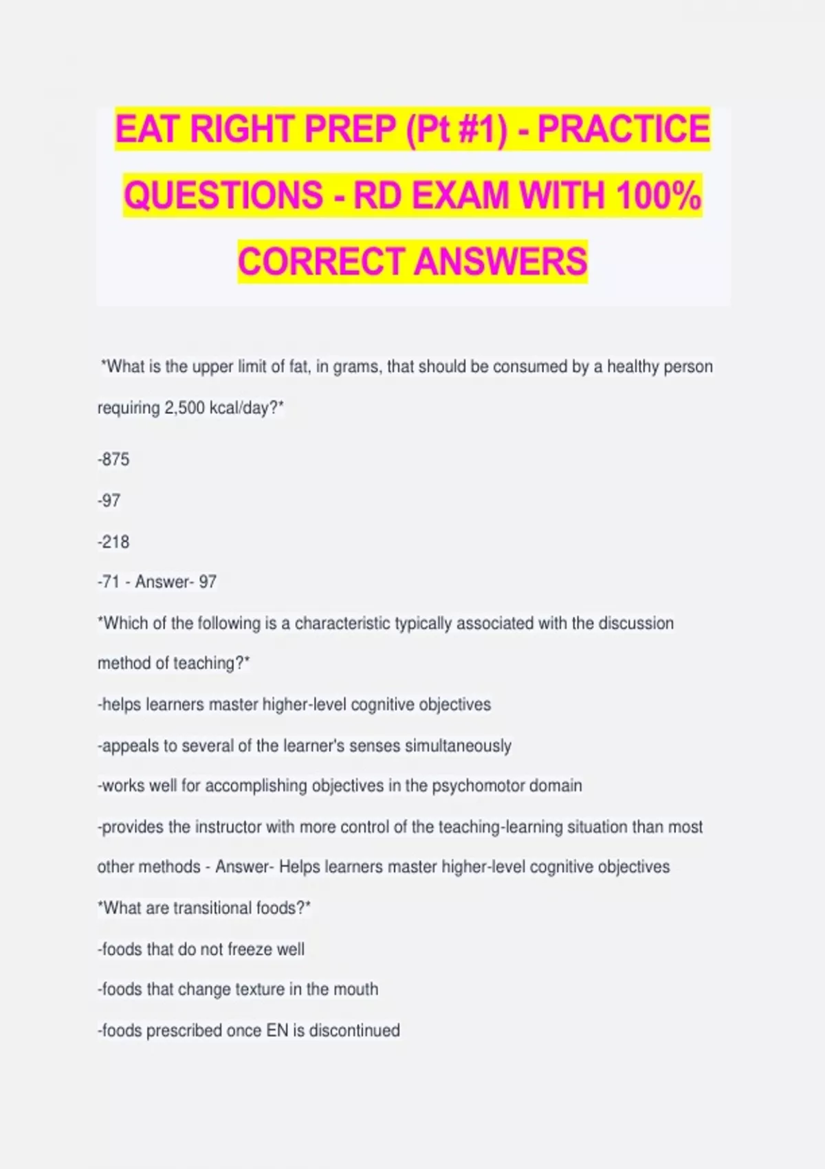 EAT RIGHT PREP (Pt #1) - PRACTICE QUESTIONS - RD EXAM WITH 100% CORRECT ANSWERS *What is the upper limit of fat, in grams, that should be consumed by a healthy person requiring 2,500 kcal/day?* -875 -97 -218 -71 - Answer- 97 *Which of the following is a characteristic typically associated with the discussion method of teaching?* -helps learners master higher-level cognitive objectives -appeals to several of the learner's senses simultaneously -works well for accomplishing objectives in the psychomotor domain -provides the instructor with more control of the teaching-learning situation than most other methods - Answer- Helps learners master higher-level cognitive objectives *What are transitional foods?* -foods that do not freeze well -foods that change texture in the mouth -foods prescribed once EN is discontinued -foods prescribed in the final diet progression stage after bariatric surgery - Answer- Foods that change texture in the mouth *Glycogenolysis is the breakdown of glycogen into glucose that occurs in the cells of the __________.* -stomach & SI -liver & muscle -kidney & brain -SI & kidney - Answer- Liver & muscle *Which agency would regulate the manufacture of canned chicken breast?* -Food Safety & Inspection Service (FSIS) -FDA -USDA -US Public Health Service (USPHS) - Answer- Food Safety & Inspection Service (FSIS) *How many kcals/oz does a standard infant formula provide?* -20 -22 -25 -28 - Answer- 20 *In the Campinha-Bacote Model, cultural competence originates in the _______.* -individual -family -community -society - Answer- Individual *What production forecasting method would be used if an assumption was made that actual occurrences follow an identifiable pattern over time?* -exponential smoothing -moving average -linear regression -a and b - Answer- A and b *Using the following figures, calculate the break-even point for the Green Cafe: Fixed costs =52000; variable costs = 85000; total sales = 210,000.* -86,666.66 -113,333.33 -130,000 -473,000 - Answer- 86,666.66 *A recipe requires 1 3/4 cup quick-cooking tapioca. Tapioca is purchased in twelve 8-oz boxes in a case and costs $41.88/case. Three cups of quick-cooking tapioca weighs 1 lb. What is the recipe cost for tapioca?* -2.33 -4.07 -5.24 -6.98 - Answer- $4.07 *What name is given to the purchasing document that is completed by the buyer and given to the supplier?* -FOB origin -purchase requisition