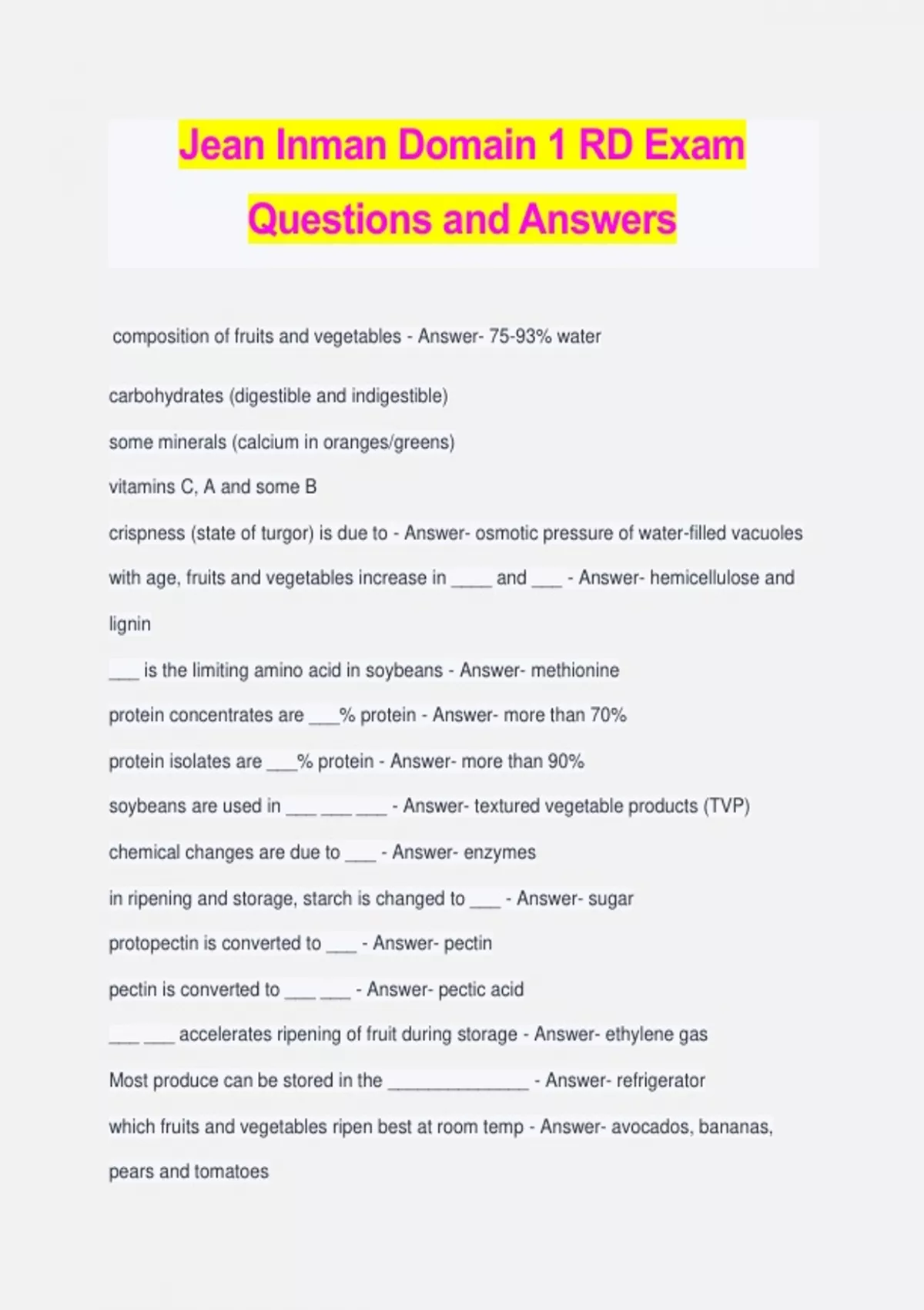 Jean Inman Domain 1 RD Exam Questions and Answers composition of fruits and vegetables - Answer- 75-93% water carbohydrates (digestible and indigestible) some minerals (calcium in oranges/greens) vitamins C, A and some B crispness (state of turgor) is due to - Answer- osmotic pressure of water-filled vacuoles with age, fruits and vegetables increase in ____ and ___ - Answer- hemicellulose and lignin ___ is the limiting amino acid in soybeans - Answer- methionine protein concentrates are ___% protein - Answer- more than 70% protein isolates are ___% protein - Answer- more than 90% soybeans are used in ___ ___ ___ - Answer- textured vegetable products (TVP) chemical changes are due to ___ - Answer- enzymes in ripening and storage, starch is changed to ___ - Answer- sugar protopectin is converted to ___ - Answer- pectin pectin is converted to ___ ___ - Answer- pectic acid ___ ___ accelerates ripening of fruit during storage - Answer- ethylene gas Most produce can be stored in the ______________ - Answer- refrigerator which fruits and vegetables ripen best at room temp - Answer- avocados, bananas, pears and tomatoes aging can be delayed in apples stored in ___ ___ - Answer- controlled atmosphere (reduced oxygen) ___ fruits ripen post-harvest - Answer- climacteric (peach, pear, banana, apple, tomato) ___ fruits are best when ripened before harvest - Answer- non-climacteric (grapes, melon, citrus) always wash raw foods to - Answer- remove dust and spray particles ___ and ___ should be washed just before serving - Answer- berries and mushrooms Fruits low in ______ darken rapidly when cut due to enzymatic action. - Answer- vitamin c to prevent darkening in cut fruit - Answer- dip in citrus juice, add sugar before freezing or heat to boiling One dozen oranges yields how much juice? - Answer- 1 quart cooking fruits and vegetables does 3 important things - Answer- softens cellulose, increases keeping quality and cooks starch when sweetener is added to liquid of packing juice, the density of the syrup is expressed as - Answer- a % by weight of sucrose syrup is measured in - Answer- degrees Brix by a Brix hydrometer 4 classifications of syrup - Answer- extra ligh