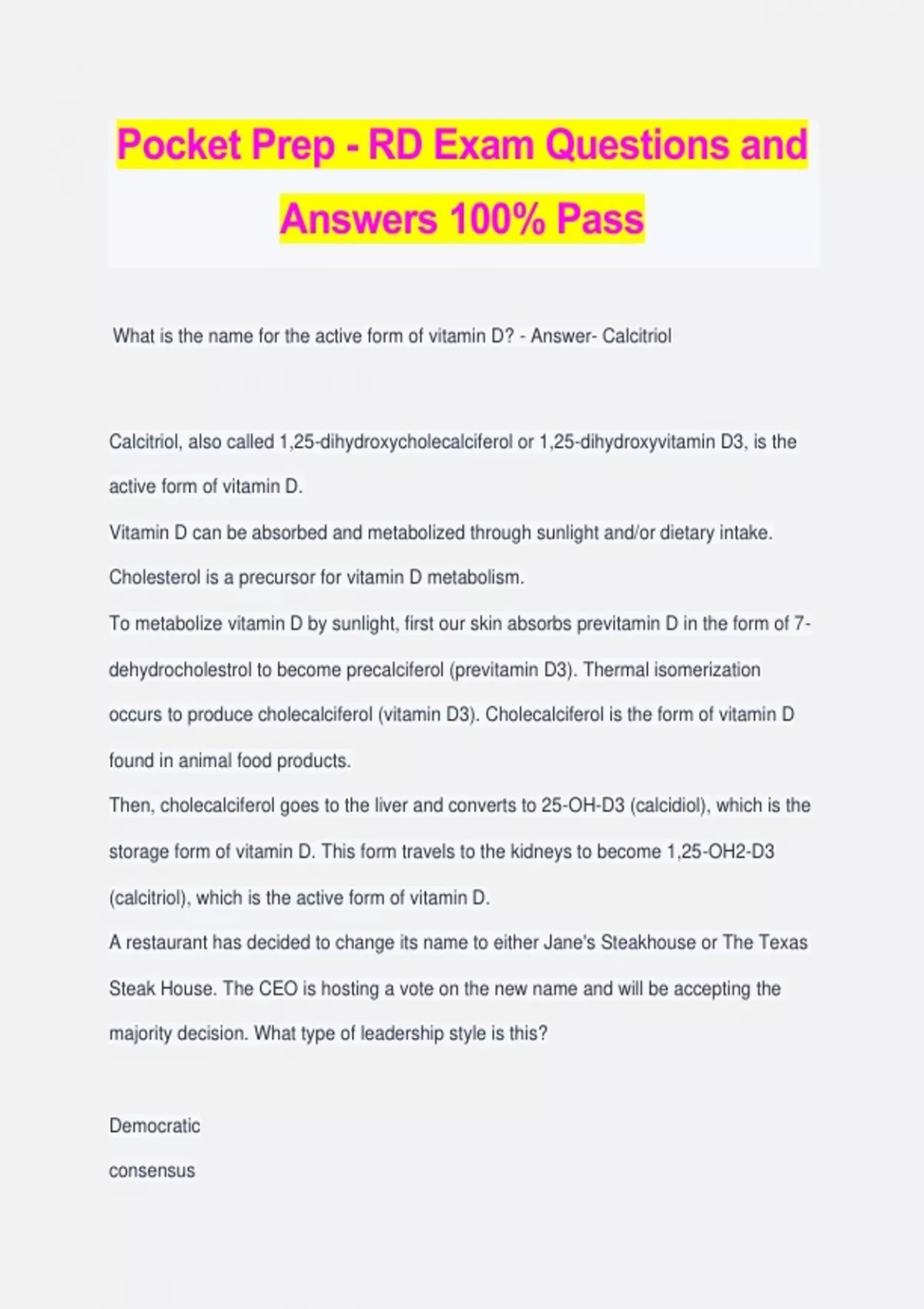 Pocket Prep - RD Exam Questions and Answers 100% Pass What is the name for the active form of vitamin D? - Answer- Calcitriol Calcitriol, also called 1,25-dihydroxycholecalciferol or 1,25-dihydroxyvitamin D3, is the active form of vitamin D. Vitamin D can be absorbed and metabolized through sunlight and/or dietary intake. Cholesterol is a precursor for vitamin D metabolism. To metabolize vitamin D by sunlight, first our skin absorbs previtamin D in the form of 7- dehydrocholestrol to become precalciferol (previtamin D3). Thermal isomerization occurs to produce cholecalciferol (vitamin D3). Cholecalciferol is the form of vitamin D found in animal food products. Then, cholecalciferol goes to the liver and converts to 25-OH-D3 (calcidiol), which is the storage form of vitamin D. This form travels to the kidneys to become 1,25-OH2-D3 (calcitriol), which is the active form of vitamin D. A restaurant has decided to change its name to either Jane's Steakhouse or The Texas Steak House. The CEO is hosting a vote on the new name and will be accepting the majority decision. What type of leadership style is this? Democratic consensus Autocratic Participative - Answer- Democratic Leadership styles and techniques reflect the personality of the management. The democratic style accepts the majority decision. The consensus style requires the entire group to come to an agreement. For example, the CEO might require everyone to meet and discuss until they all agree on which restaurant name to go with. The participative style seeks input from and shares power with employees. A participative CEO might have used this method to brainstorm ideas for the new name with the employees. The autocratic style takes control, makes decisions, and assumes full responsibility. An autocratic CEO would choose the new restaurant's name on his own without input from the employees. A manager performs in a decisional role when committing an organization to a specific course of action or strategy. Whose management theory is this an example of? Taylor's Scientific Management Mintzberg's Management Roles Katz's Skills Management Drucker's Management by Objectives - Answer- Mintzberg's Management Roles Mintzberg's Management Roles argued there are ten primary roles that can be used to categorize a manager's different functions to accomplish work and use skills. Katz's Skill Management identified three managerial skills essential to successful management: technical, human, and conceptual. Drucker's Management by Objectives (MBO) is the process of defining specific objectives within an organization that management can convey to organization members, then deciding how to achieve each objective in sequence. Taylor's Scientific Management is a theory that analyzes and synthesizes workflows, with the main objective being to improve economic efficiency, especially labor productivity. You want to convey timely and relevant food and nutrition-related news to the public. All of the following activities would help you, except: Attending continuing education meeting and scientific conferences Reading Food & Nutrition Magazine Visiting your local bookstore to browse the shelves of diet books, cookbooks and sef- help books Developing the appropriate marketing mix - Answer- Developing the appropriate marketing mix The marketing mix is developed to achieve an organization's objectives and satisfy the target market. The 4 P's of the marketing mix are product, place, price, and promotion. When working with the media, it is important to follow professional literature and know what the public wants to read, view, and hear. Examples include: Reading Food & Nutrition Magazine Visiting your local bookstore to browse the shelves of diet books, cookbooks and self- help books Attending continuing education meeting and scientific conferences What can be inferred about a patient with a HgbA1C of 5.7%? T2DM Prediabetic T1DM GDM - Answer- Prediabetic Prediabetes is indicated by an HgbA1C of 5.7-6.4, which puts a patient at risk for developing diabetes. Diabetes (T1DM/T2DM) is diagnosed by a fasting plasma glucose of ≥126 mg/dL, a glucose tolerance test of ≥200 mg/dL, or an HgbA1C of ≥ 6.5%. Gestational diabetes (GDM) is diagnosed at 24-28 weeks of gestation with a glucose tolerance test of ≥140mg/dL to indicate further testing. Using the chart below and the moving average model, determine the second forecast for the seven-day moving average. Day # | #of Patients who selected fish 1 50 2 54 3 60 4 56 5 53 6 63 7 69 8 62 9 64 - Answer- 59.57 The moving average model is a time series method of forecasting where a group of past records are averaged and used as the forecast. The next forecast (second) is calculated by dropping the first number and adding the next. To solve for the second forecast (total of days 2 through 8): 54+60+56+53+63+69+62 = 417 / 7 = 59.57 Which of the following nutritional problems is not common in the elderly? polypharmacy