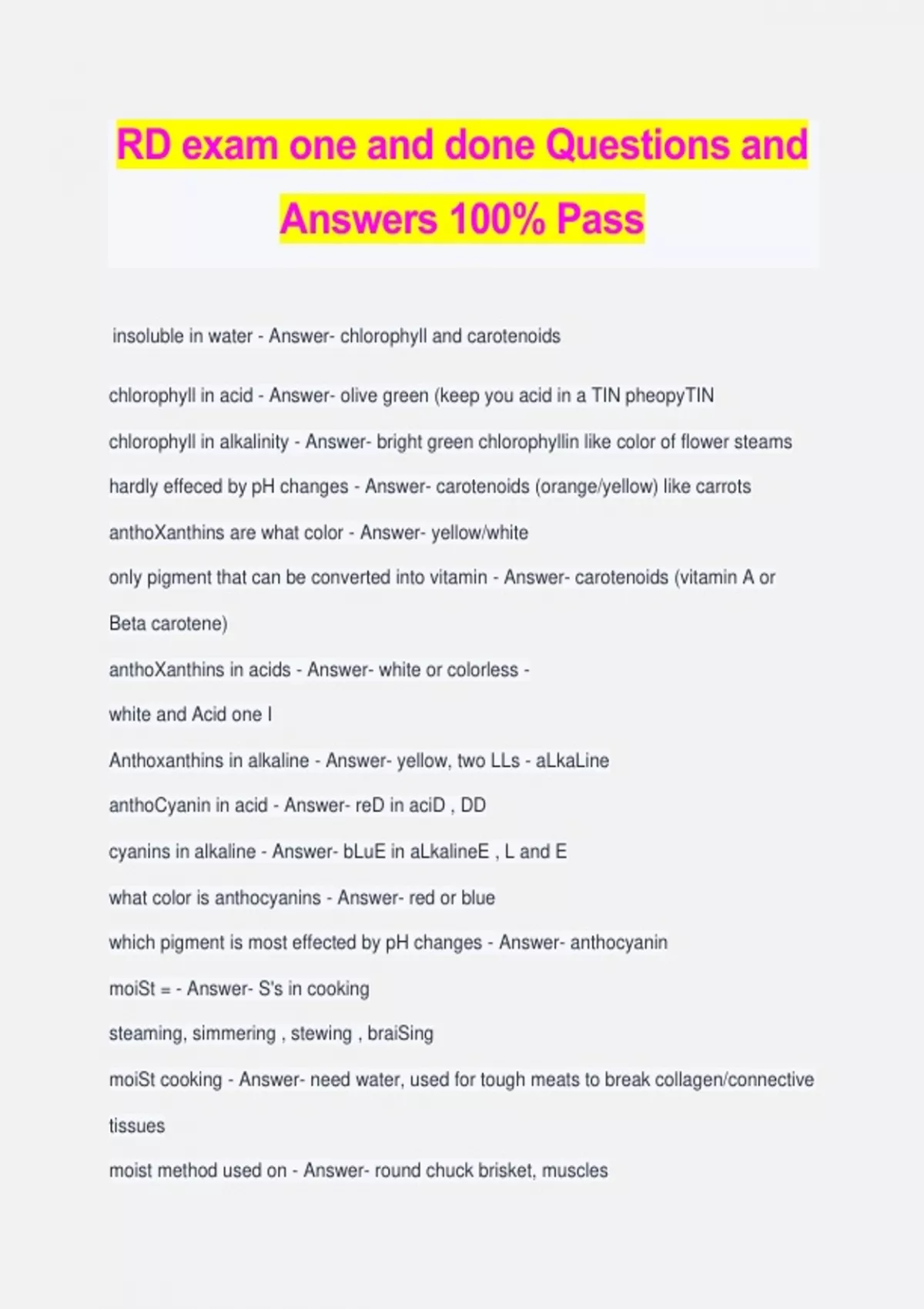 RD exam one and done Questions and Answers 100% Pass insoluble in water - Answer- chlorophyll and carotenoids chlorophyll in acid - Answer- olive green (keep you acid in a TIN pheopyTIN chlorophyll in alkalinity - Answer- bright green chlorophyllin like color of flower steams hardly effeced by pH changes - Answer- carotenoids (orange/yellow) like carrots anthoXanthins are what color - Answer- yellow/white only pigment that can be converted into vitamin - Answer- carotenoids (vitamin A or Beta carotene) anthoXanthins in acids - Answer- white or colorless - white and Acid one I Anthoxanthins in alkaline - Answer- yellow, two LLs - aLkaLine anthoCyanin in acid - Answer- reD in aciD , DD cyanins in alkaline - Answer- bLuE in aLkalineE , L and E what color is anthocyanins - Answer- red or blue which pigment is most effected by pH changes - Answer- anthocyanin moiSt = - Answer- S's in cooking steaming, simmering , stewing , braiSing moiSt cooking - Answer- need water, used for tough meats to break collagen/connective tissues moist method used on - Answer- round chuck brisket, muscles chuck makes me moist when he takes off my bra - Answer- chuck meats best if braised which is a moist method DRy= R's in cooking - Answer- yes dry cooking methods - Answer- no water, usde for tender cutes near the backbones dry meats - Answer- lion, sirloins, etc Frying, Broiling, grilling, roasting - Answer- dry methods frying - Answer- highest smoke point, rancidity of fat involves unsaturated FA broiling - Answer- radiated heats roasting - Answer- carry over cooking from oven to counter phytochemicals and functional foods - Answer- naturally occuring compounds in fruit, veggies, whole grains, etc to PHYT off diseases iSOflavones - Answer- soy foods (help lower cholesterol ex. tofu thiols (aka indoles) - Answer- cruciferous vegetables (helps detoxify carcinogens) ex. brussel sprouts, onion, garlic, broccoil --> acidic and bitter lignans - Answer- whole grains (helps breast cancer)