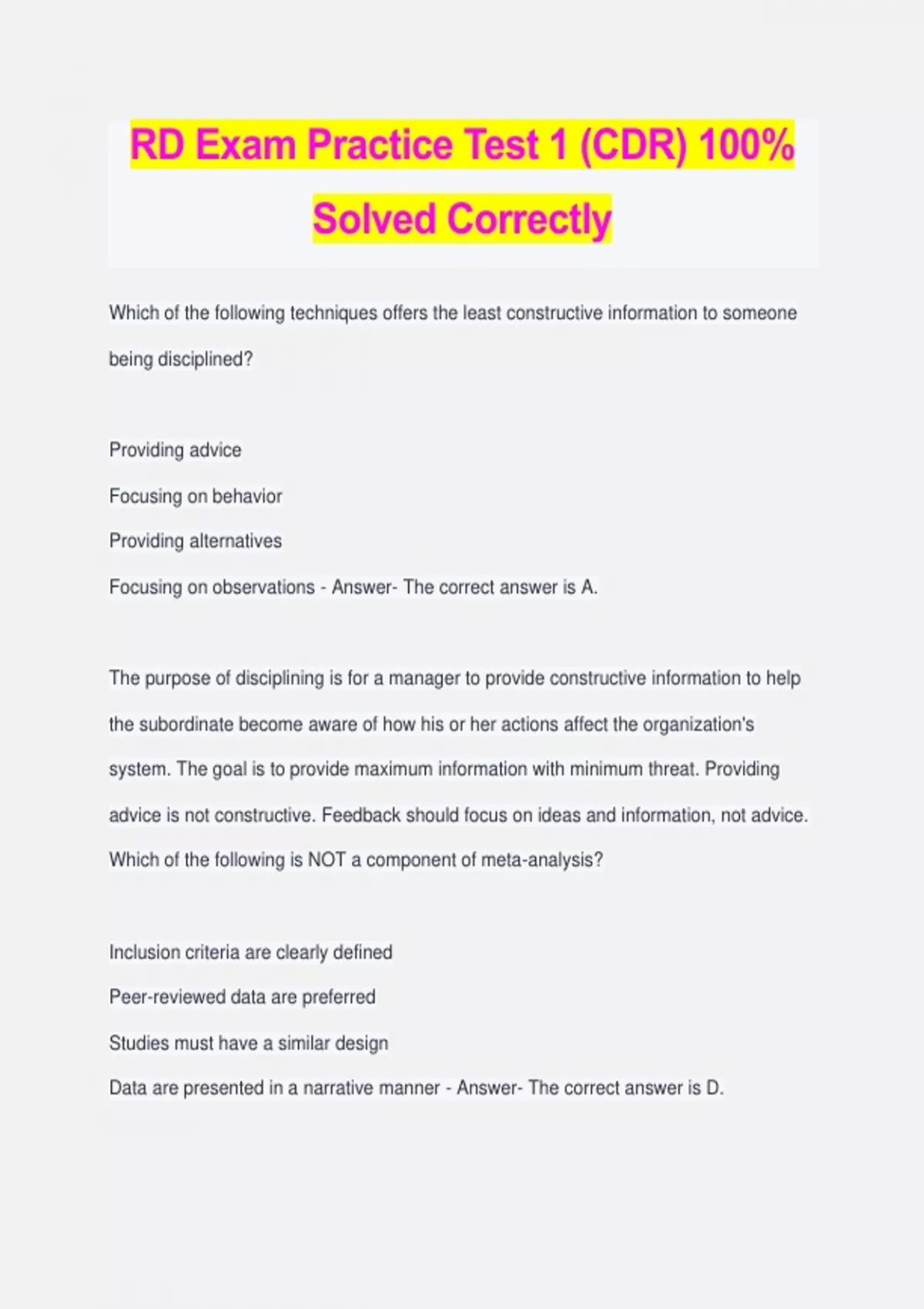 RD Exam Practice Test 1 (CDR) 100% Solved Correctly Which of the following techniques offers the least constructive information to someone being disciplined? Providing advice Focusing on behavior Providing alternatives Focusing on observations - Answer- The correct answer is A. The purpose of disciplining is for a manager to provide constructive information to help the subordinate become aware of how his or her actions affect the organization's system. The goal is to provide maximum information with minimum threat. Providing advice is not constructive. Feedback should focus on ideas and information, not advice. Which of the following is NOT a component of meta-analysis? Inclusion criteria are clearly defined Peer-reviewed data are preferred Studies must have a similar design Data are presented in a narrative manner - Answer- The correct answer is D. Meta-analysis uses studies with similar design, defines inclusion criteria, and usually uses peer-reviewed articles. There is no criterion or requirement that data have to be presented in a narrative manner. What elements comprise the marketing mix? Product, price, promotion, and place Price, product, popularity, and process Product, promotion, position, and popularity Product, place, position, and process - Answer- The correct answer is A. Marketing mix is a combination of product, price, place and promotion to achieve an organization's objectives and to satisfy the target market. A product can be a good, a service, or an idea. Price is the amount of money charged for a product. Promotion is used to facilitate exchanges by informing prospective customers about a business and its products. Place refers to the location, the place where the product is offered. The terms "popularity," "process," and "position" have no relevance in marketing mix. Which agency approves the use of food additives in breakfast cereal? US Department of Agriculture (USDA) Environmental Protection Agency (EPA) Food and Drug Administration (FDA) Federal Trade Commission (FTC) - Answer- The correct answer is C. The FDA regulates use of food additives—including coloring agents considered safe for human consumption and additives that are considered safe for human consumption or generally recognized as safe (GRAS) by the scientific community. Any food that contains a food additive that is not deemed safe is considered an adulterated food by FDA standards. Which of the following characteristics is key to an efficient and effective system? Continuous response and adaptation to the system Flow of resources Interdependency of parts Achievement of subunit objectives - Answer- The correct answer is C. A system is a collection of interrelated parts or subsystems unified by design to obtain one or more objectives. Interdependency is the reciprocal relationship of the parts of a system; each part mutually affects the performance of the others. Interdependency emphasizes the importance of viewing the organization as a whole rather than as isolated parts. The other responses (ie, continuous response and adaptation to a system, flow of resources through a system, and achievement of subunit objectives) all are isolated parts of a system.