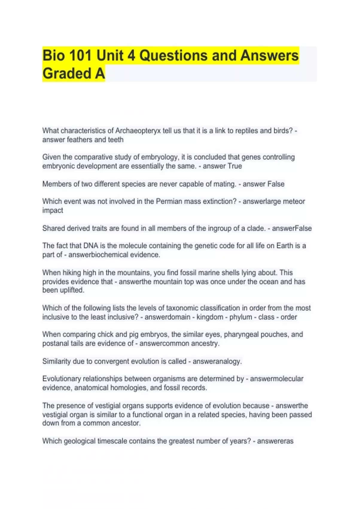 Bio 101 Unit 4 Questions and Answers Graded A