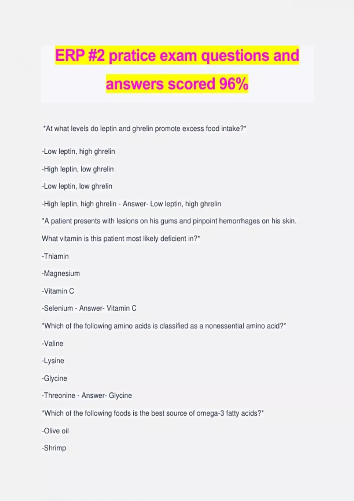 ERP #2 pratice exam questions and answers scored 96% *At what levels do leptin and ghrelin promote excess food intake?* -Low leptin, high ghrelin -High leptin, low ghrelin -Low leptin, low ghrelin -High leptin, high ghrelin - Answer- Low leptin, high ghrelin *A patient presents with lesions on his gums and pinpoint hemorrhages on his skin. What vitamin is this patient most likely deficient in?* -Thiamin -Magnesium -Vitamin C -Selenium - Answer- Vitamin C *Which of the following amino acids is classified as a nonessential amino acid?* -Valine -Lysine -Glycine -Threonine - Answer- Glycine *Which of the following foods is the best source of omega-3 fatty acids?* -Olive oil -Shrimp -Avocado -Sardines - Answer- Sardines *What name is given to the chronological sequence of activities to carry out organizational behavior?* -Policy -Procedure -Method -Rule - Answer- Procedure *Which is an example of chemical contamination?* -Acidic action of foods with metal-lined containers -Metal curls from a worn-out can opener that fell into the food when the can is being opened -Development of an off-flavor due to uncontrolled enzyme reaction -Anisakis contamination from fish - Answer- Acidic action of foods with metal-lined containers *Which kind of damage results from dehydration of a frozen breaded chicken patty due to extreme cold?
