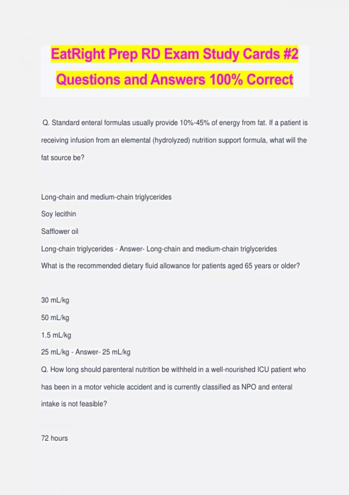 EatRight Prep RD Exam Study Cards #2 Questions and Answers 100% Correct Q. Standard enteral formulas usually provide 10%-45% of energy from fat. If a patient is receiving infusion from an elemental (hydrolyzed) nutrition support formula, what will the fat source be? Long-chain and medium-chain triglycerides Soy lecithin Safflower oil Long-chain triglycerides - Answer- Long-chain and medium-chain triglycerides What is the recommended dietary fluid allowance for patients aged 65 years or older? 30 mL/kg 50 mL/kg 1.5 mL/kg 25 mL/kg - Answer- 25 mL/kg Q. How long should parenteral nutrition be withheld in a well-nourished ICU patient who has been in a motor vehicle accident and is currently classified as NPO and enteral intake is not feasible? 72 hours >7 days 10 days 24 hours - Answer- >7 days Which of the following nutrients uses the highest amount of energy for metabolism and storage? Fat Protein Carbohydrates Alcohol - Answer- Protein Q. Which of the following is a concern in patients who are unable to initiate an oral diet or enteral nutrition and need to start parenteral nutrition? Decreased peristalsis Increased peristalsis Inadequate energy intake Bacterial translocation possibly resulting in infection - Answer- Bacterial translocation possibly resulting in infection For all classes of obesity, the goal of enteral feeding in the intensive care unit should be _____ of target energy expenditure by indirect calorimetry. 50% to 55% 55% to 65% 65% to 70% 70% to 80% - Answer- 65% to 70% Which of the following is NOT a function of lipids? They act as thermal insulation for certain organs They provide energy during starvation They provide structure to hair, bones, and teeth They act as electrical insulators along myelinated nerves - Answer- They provide structure to hair, bones, and teeth Which of the following denotes an enlargement of an organ or tissues caused by growth in cell size? Hyperplasia Hypertrophy Maturation Cellular replication - Answer- Hypertrophy