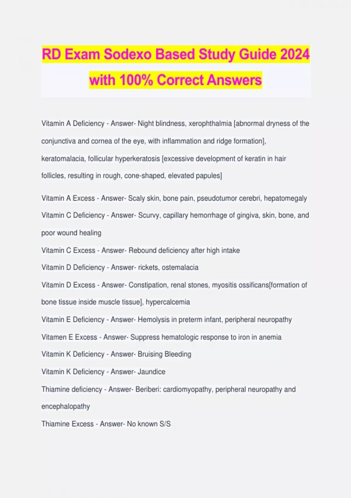 RD Exam Sodexo Based Study Guide 2024 with 100% Correct Answers Vitamin A Deficiency - Answer- Night blindness, xerophthalmia [abnormal dryness of the conjunctiva and cornea of the eye, with inflammation and ridge formation], keratomalacia, follicular hyperkeratosis [excessive development of keratin in hair follicles, resulting in rough, cone-shaped, elevated papules] Vitamin A Excess - Answer- Scaly skin, bone pain, pseudotumor cerebri, hepatomegaly Vitamin C Deficiency - Answer- Scurvy, capillary hemorrhage of gingiva, skin, bone, and poor wound healing Vitamin C Excess - Answer- Rebound deficiency after high intake Vitamin D Deficiency - Answer- rickets, ostemalacia Vitamin D Excess - Answer- Constipation, renal stones, myositis ossificans[formation of bone tissue inside muscle tissue], hypercalcemia Vitamin E Deficiency - Answer- Hemolysis in preterm infant, peripheral neuropathy Vitamen E Excess - Answer- Suppress hematologic response to iron in anemia Vitamin K Deficiency - Answer- Bruising Bleeding Vitamin K Deficiency - Answer- Jaundice Thiamine deficiency - Answer- Beriberi: cardiomyopathy, peripheral neuropathy and encephalopathy Thiamine Excess - Answer- No known S/S Riboflavin Deficiency - Answer- cheilosis (dry, scaly lips), glossitis (inflammed tongue), diarrhea, dermatitis Riboflavin Excess - Answer- No known S/S Niacin Deficiency - Answer- Pellagra: dementia, diarrhea, and dermatitis Niacin Excess - Answer- Flushing (redness of skin) Pyridoxine deficiency - Answer- seizures, anemia, and irratibility Pyridoxine excess - Answer- neuropathy Biotin deficiency - Answer- dermatitis, alopecia, muscle pain Biotin Excess - Answer- No known S/S Folate deficiency - Answer- macrocytic anemia, stomatitis (inflammation of the mouth), parasthesia (abnormal prickling type sensation), glossitis(inflamed tongue), neural tube defects of the fetus