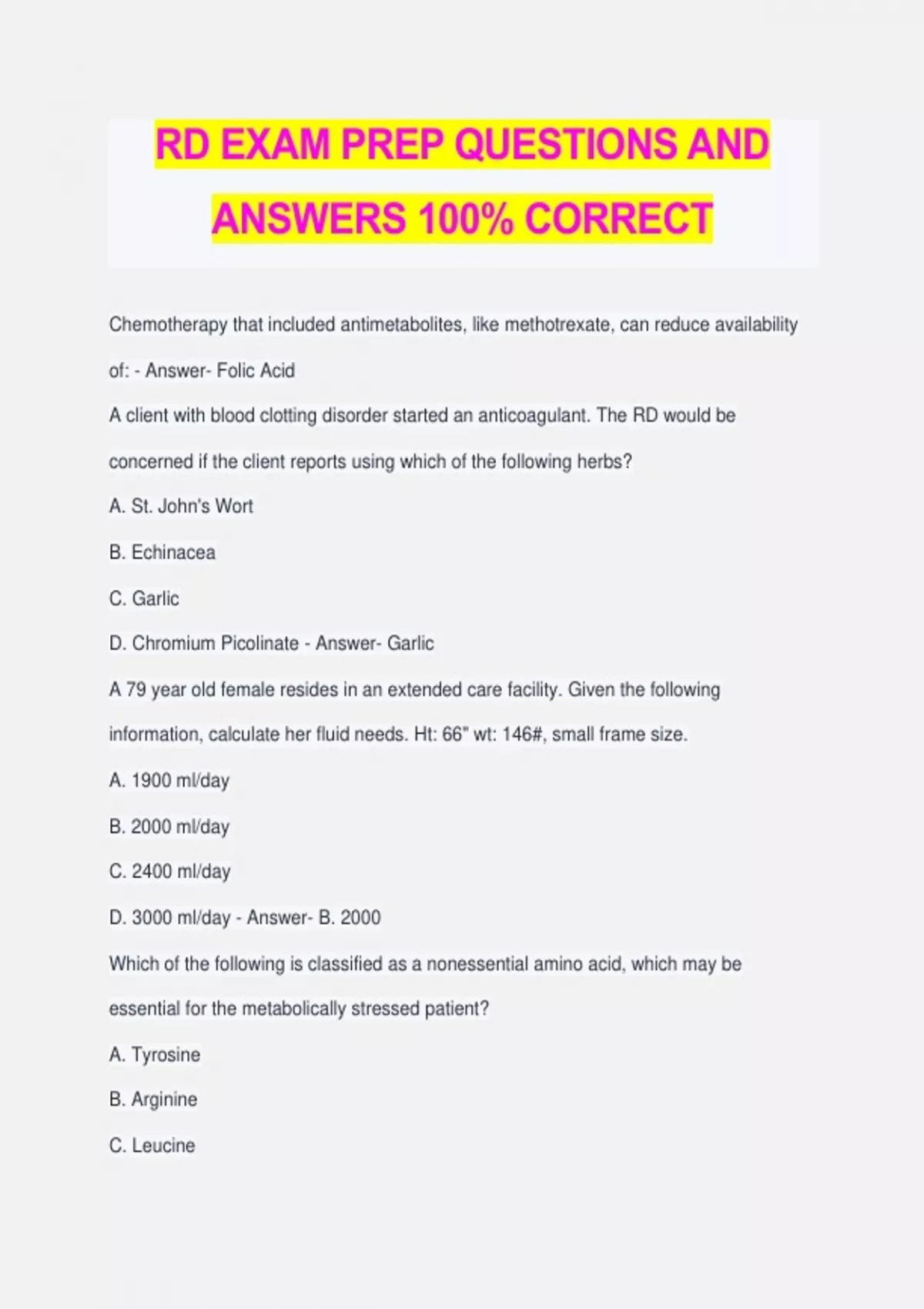 RD EXAM PREP QUESTIONS AND ANSWERS 100% CORRECT Chemotherapy that included antimetabolites, like methotrexate, can reduce availability of: - Answer- Folic Acid A client with blood clotting disorder started an anticoagulant. The RD would be concerned if the client reports using which of the following herbs? A. St. John's Wort B. Echinacea C. Garlic D. Chromium Picolinate - Answer- Garlic A 79 year old female resides in an extended care facility. Given the following information, calculate her fluid needs. Ht: 66" wt: 146#, small frame size. A. 1900 ml/day B. 2000 ml/day C. 2400 ml/day D. 3000 ml/day - Answer- B. 2000 Which of the following is classified as a nonessential amino acid, which may be essential for the metabolically stressed patient? A. Tyrosine B. Arginine C. Leucine D. Lysine - Answer- B.Arginine (only nonessential A.A. are Tyrosine and arginine) A severely malnourished patient receives TPN at a rate of 125 cc/hr. What could result? A. Hyperphosphatemia B. Hypermagnesemia C. Hypophosphatemia D. Hyponatremia - Answer- C. Hypophosphatemia The management of a burn pt includes the following nonprotein kilocalorie: nitrogen ratio. A. 300:1 B. 250:1 C. 200:1 D. 150:1 - Answer- D. A patient has been admitted to the hospital following a CVA, and the RD is informed that a swallowing evaluation indicates that the patient has dysphagia. The RD's first step should be: A. interview the patient's family to find out if there were any swallowing difficulties or eating problems prior to admission B. recommend a level 1 Pureed Dysphagia diet to be advanced as tolerated C. review the results and recommendations of the swallowing evaluation to determine the degree of dysphagia present D. inform the food service staff that the patient will need thickened liquids - Answer- C. review the results and recommendations of the swallowing evaluation to determine the degree of dysphagia present A patient has been on an enteral feeding for 5 days without complications, and then develops diarrhea. What would be the most likely cause? A. concentration of the tube feeding B. rate of the tube feeding C. amount of free water flush D. new medication - Answer- D. Metabolic alterations of Systemic Inflammatory Response Syndrome (SIRS) or sepsis include all of the following except: A. hypermetabolism B. hypoglycemia C. accelerated lipolysis D. protein catabolism - Answer- B. hypoglycemia A nutrition care plan recommendation of 30-35 kcal/kg and 1.0-1.2 g protein/kg per day would be appropriate for which type of liver disease? A. hepatitis B. fatty liver C. encephalopathy D. liver failure - Answer- A. hepatitis