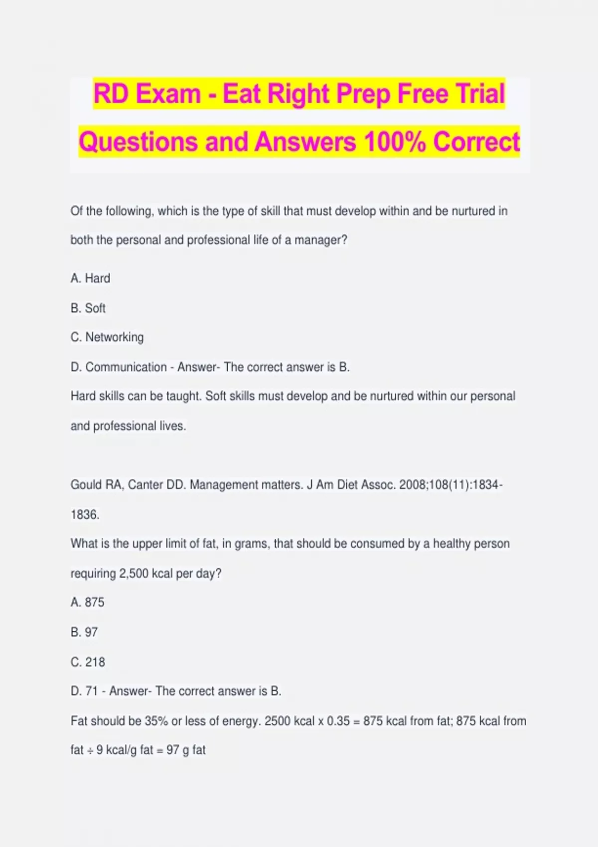 RD Exam - Eat Right Prep Free Trial Questions and Answers 100% Correct Of the following, which is the type of skill that must develop within and be nurtured in both the personal and professional life of a manager? A. Hard B. Soft C. Networking D. Communication - Answer- The correct answer is B. Hard skills can be taught. Soft skills must develop and be nurtured within our personal and professional lives. Gould RA, Canter DD. Management matters. J Am Diet Assoc. 2008;108(11):1834- 1836. What is the upper limit of fat, in grams, that should be consumed by a healthy person requiring 2,500 kcal per day? A. 875 B. 97 C. 218 D. 71 - Answer- The correct answer is B. Fat should be 35% or less of energy. 2500 kcal x 0.35 = 875 kcal from fat; 875 kcal from fat ÷ 9 kcal/g fat = 97 g fat Whitney EN, Rolfes S. Understanding Nutrition. 13th ed. Boston, MA: Cengage; 2012. Which of the following is a characteristic typically associated with the discussion method of teaching? A. Helps learners master higher-level cognitive objectives B. Appeals to several of the learner's senses simultaneously C. Works well for accomplishing objectives in the psychomotor domain D. Provides the instructor with more control of the teaching-learning situation than most other methods - Answer- The correct answer is A. The cognitive domain involves knowledge and the development of intellectual skills. This includes the recall or recognition of specific facts, procedural patterns, and concepts that serve in the development of intellectual abilities and skills. Holli BB, Williams AB. Communication & Education Skills for Dietetics Professionals. 5th ed. Baltimore, MD: Williams & Wilkins; 2008:262-264. What are transitional foods? A. Foods that do not freeze well B. Foods that change texture in the mouth C. Foods prescribed once enteral nutrition is discontinued D. Foods prescribed in the final diet progression stage after bariatric surgery - Answer- The correct answer is B. "Transitional foods" are substances that change quickly to become easier to chew or swallow with added moisture (eg, water or saliva) or a change in temperature. Frozen desserts such as ice cream, sherbet, malts, frozen yogurt and some potato chips are considered transitional foods. Reference: International Dysphagia Diet Standardisation Initiative. What are transitional foods? Accessed September 22, 2019. Glycogenolysis is the breakdown of glycogen into glucose that occurs in the cells of the _____. A. stomach and small intestine B. liver and muscle C. kidney and brain small intestine and kidney - Answer- The correct answer is B. Glycogenolysis is the process by which glycogen, the primary carbohydrate stored in the liver and muscle cells of animals, is broken down into glucose to provide immediate energy and to maintain blood glucose levels during fasting. Glycogenolysis occurs primarily in the liver. McGuire M, Beerman KA. Nutritional Sciences: From Fundamentals to Food. 3rd ed. Boston, MA: Cengage; 2012 Which agency would regulate the manufacture of canned chicken breast? A. Food Safety and Inspection Service (FSIS) B. Food and Drug Administration (FDA) C. US Department of Agriculture (USDA) D. US Public Health Service (USPHS) - Answer- The correct answer is A. The FSIS is responsible for the inspection of canned products that contain at least 2% cooked meat or poultry. Brown AC. Understanding Food: Principles and Preparation. 5th ed. Boston, MA: Cengage; 2014. How many kilocalories per ounce does a standard infant formula provide? A. 20 B. 22 C. 25 D. 28 - Answer- The correct answer is A. A standard infant formula contains 20 kcal/oz. Higher-concentrated formulas are appropriate for preterm infants or for those with specific diseases. American Academy of Pediatrics. Pediatric Nutrition Handbook. 7th ed. Elk Grove Village, IL: American Academy of Pediatrics; 2013. In the Campinha-Bacote Model, cultural competence originates in the _____. A. individual B. family C. community D. society - Answer- The correct answer is A. According to the Campinha-Bacote model, culture competence originates in the individual. Goody CM, Drago L, eds. Cultural Food Practices. Chicago: ADA; 2010: xiv-xvii. What production forecasting method would be used if an assumption was made that actual occurrences follow an identifiable pattern over time? A. Exponential smoothing B. Moving average C. Linear regression D. Both A and B - Answer- The correct answer is D. According to Gregoire and Spears, "The frequently used time series forecasting model involves the assumption that actual occurrences follow an identifiable pattern over time." Options A and B are examples of times series models. Gregoire MB, Spears MC. Foodservice Organizations: A Managerial and Systems Approach. 7th ed. Upper Saddle River, NJ: Prentice-Hall; 2009:173. Using the following figures, calculate the break-even point for The Green Café: Fixed costs = $52,000; variable costs = $85,000; total sales = $210,000. A. $86,666.66 B. $113,333.33 C. $130,000.00 D. $473,000.00 - Answer- The correct answer is A. Break-even point in sales = Fixed costs/Contribution margin ratio Contribution margin ratio = Contribution margin/Total sales Contribution margin = Total sales - Variable costs To figure out the break-even point in this question: 1. Determine contribution margin $210,000- $85,000= $125,000 2. Determine contribution ratio $125,000/$210,000=.595 Round this figure to .60 3. Determine break-even point $52,000/.60=$86,666.66
