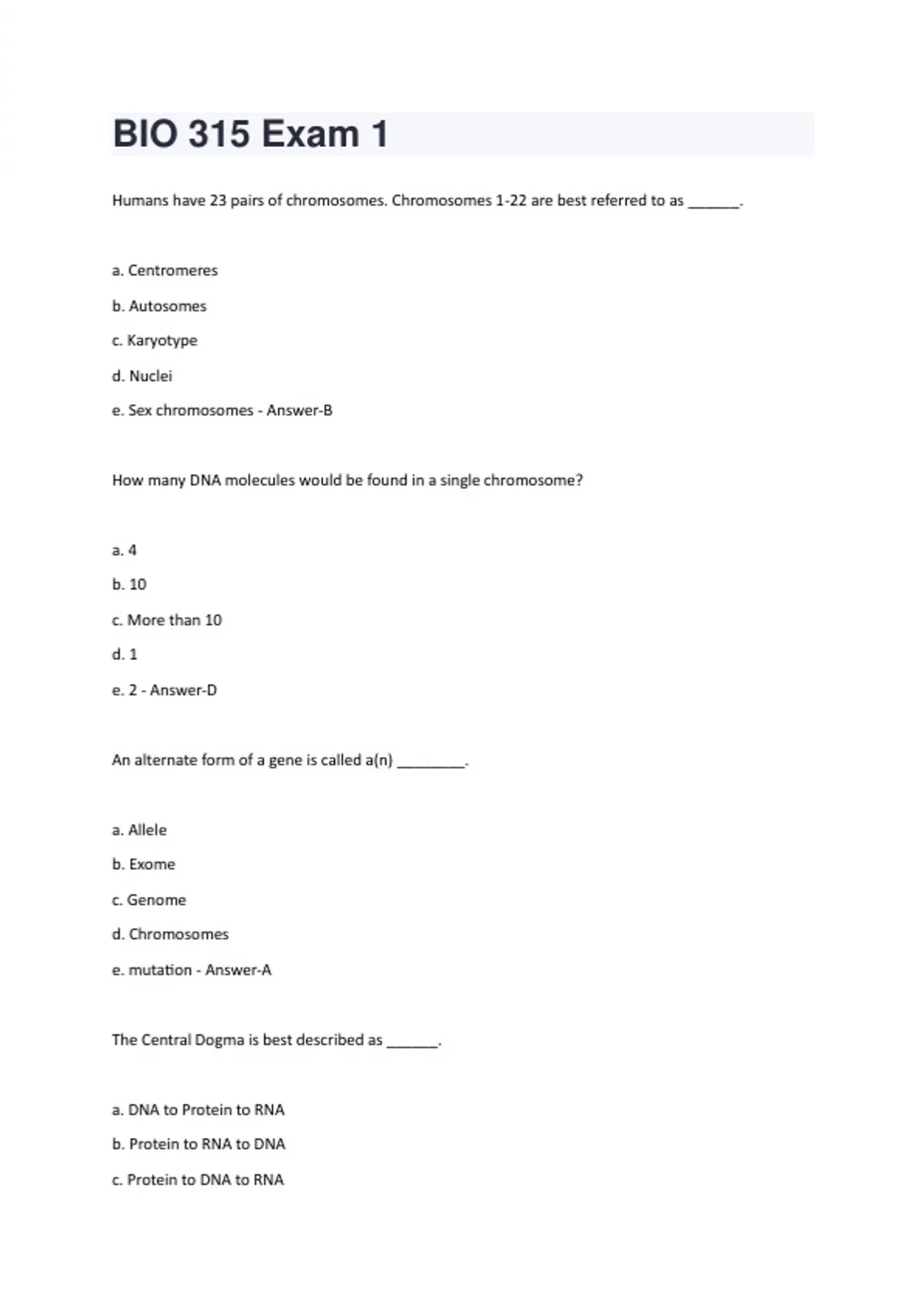 Humans have 23 pairs of chromosomes. Chromosomes 1-22 are best referred to as ______. a. Centromeres b. Autosomes c. Karyotype d. Nuclei e. Sex chromosomes - Answer-B How many DNA molecules would be found in a single chromosome? a. 4 b. 10 c. More than 10 d. 1 e. 2 - Answer-D An alternate form of a gene is called a(n) ________. a. Allele b. Exome c. Genome d. Chromosomes e. mutation - Answer-A The Central Dogma is best described as ______. a. DNA to Protein to RNA b. Protein to RNA to DNA c. Protein to DNA to RNAd. RNA to Protein to DNA e. DNA to RNA to Protein - Answer-E The genome of a person from Mt. Pleasant and the genome of a person from Bombay India are about _____ dfferent. a. 75% b. 50% c. 0.50% d. 5% e. Greater than 90% - Answer-C A person's genes is their ______ and the proteins they make contribute to a person's ________. a. phenotype; genotype b. genotype; phenotype - Answer-B Which of the following is NOT a type of macromolecule? a. Lipids b. Proteins c. Ribosomes d. Carbohydrates e. Nucleic Acids - Answer-C The inborn error of metabolism disease of Lesch Nyhan syndrome is caused by the inability to properly metabolize ______. a. carbohydrates. b. lipids c. purines. d. specific amino acids. - Answer-CWhich of the following is true of the lysosome? a. The lysosome is responsible for adding sugars to proteins. b. The lysosome provides most of the energy (ATP) for a cell. c. The lysosome contains DNA. d. The lysome when not functioning properly is linked to Zellweger's syndrome. e. The lysosome breaks down cellular components. - Answer-E