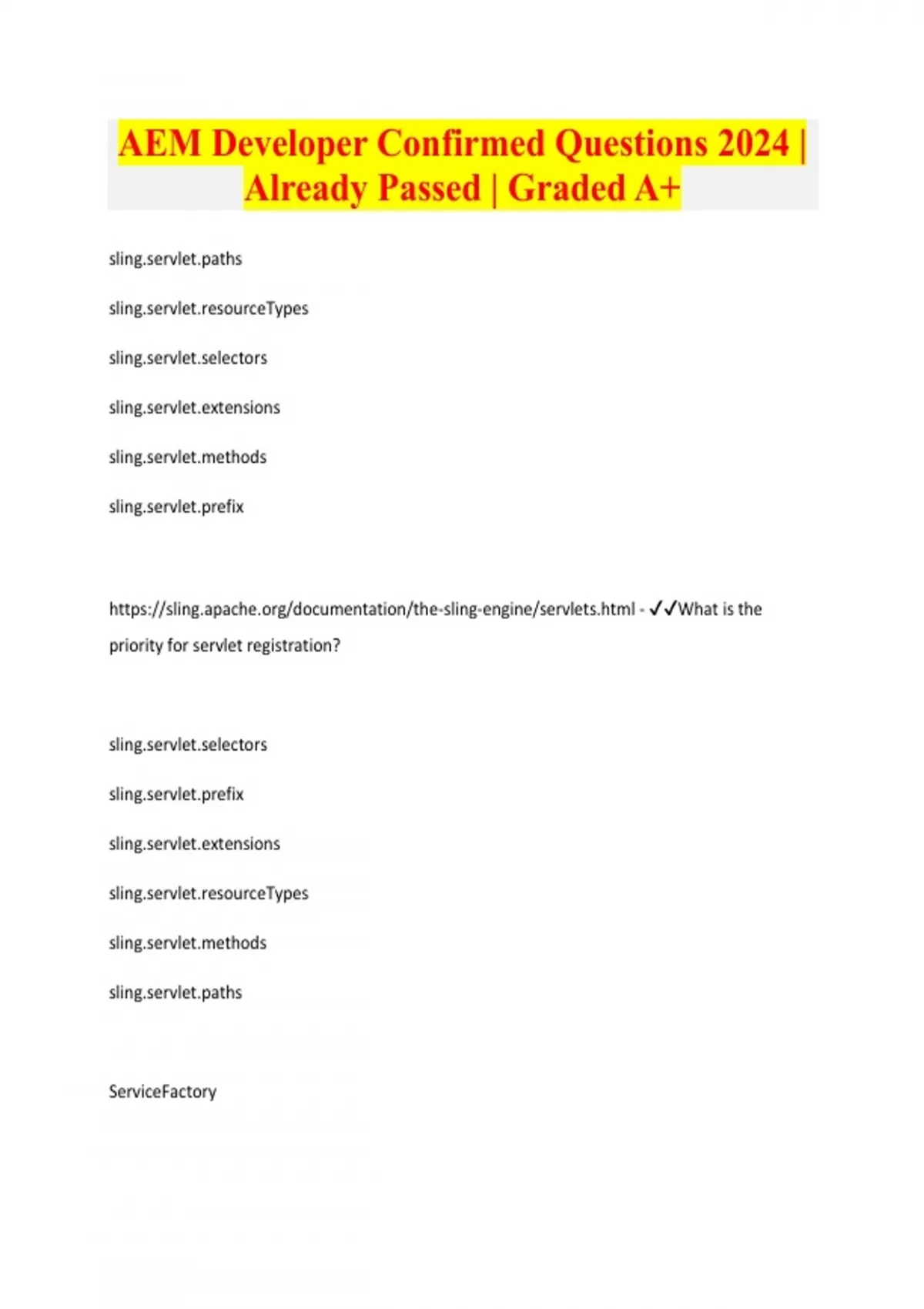 AEM Developer Confirmed Questions 2024 | Already Passed | Graded A + sling.servlet.paths sling.servlet.resourceTypes sling.servlet.selectors sling.servlet.extensions sling.servlet.methods sling.servlet.prefix https://sling.apache.org/documentation/the -sling -engine/servlets.html - ✔✔What is the priority for servlet registration? sling.servlet.selectors sling.servlet.prefix sling.servlet.extensions sling.servlet.resourceTypes sling.servlet.methods sling.servlet.paths ServiceFactory Lavanya notes: ServiceFactory attribute for the annotation @Service Cam notes: serviceFactory Defaut: false SCR Descript or: service.servicefactory Whether the component is registered as a ServiceFactory or not http://felix.apache.org/documentation/subprojects/apache -felix -maven -scr-plugin/scr -