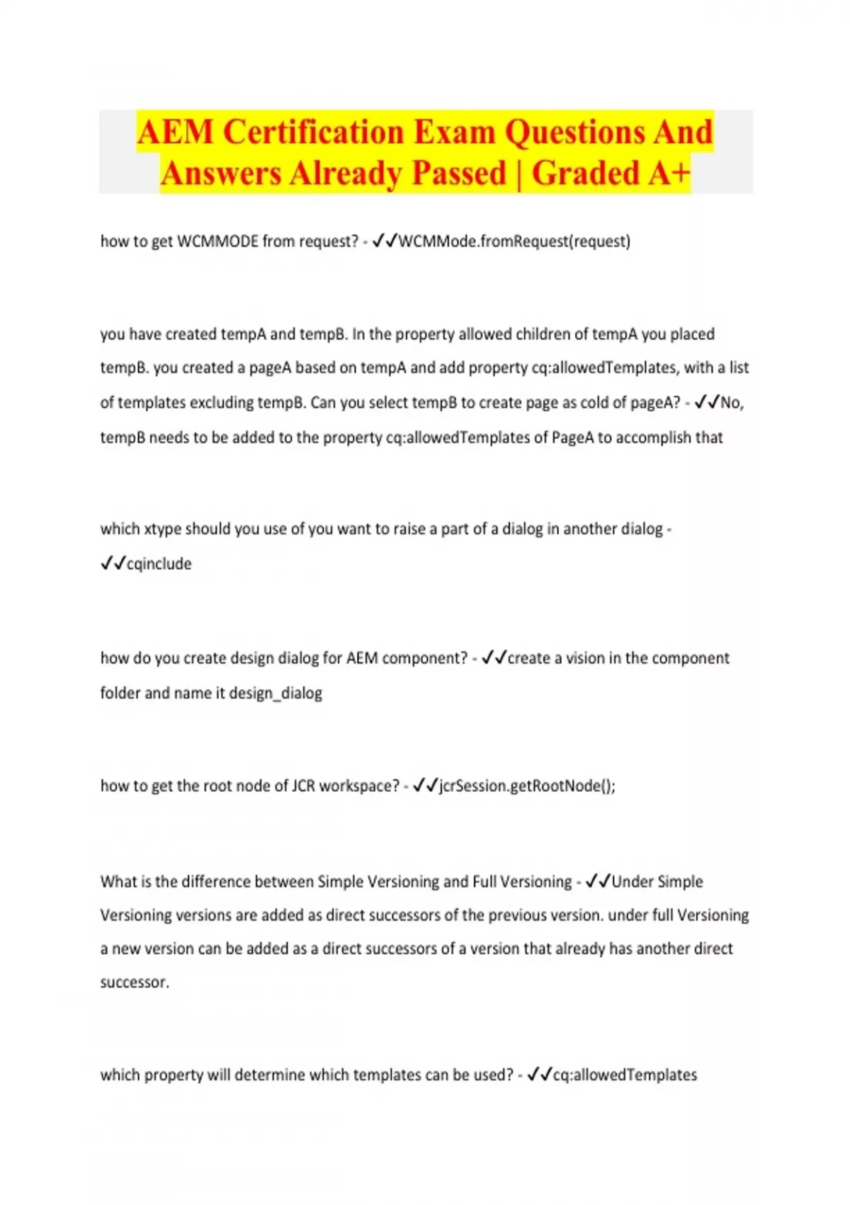 AEM Certification Exam Questions And Answers Already Passed | Graded A+ how to get WCMMODE from request? - WCMMRequest(request) you have created tempA and tempB. In the property allowed children of tempA you placed tempB. you created a pageA based on tempA and add property cq:allowedTemplates, with a list of templates excluding tempB. Can you select tempB to create page as cold of pageA? - No, tempB needs to be added to the property cq:allowedTemplates of PageA to accomplish that which xtype should you use of you want to raise a part of a dialog in another dialog - cqinclude how do you create design dialog for AEM component? - create a vision in the component folder and name it design_dialog