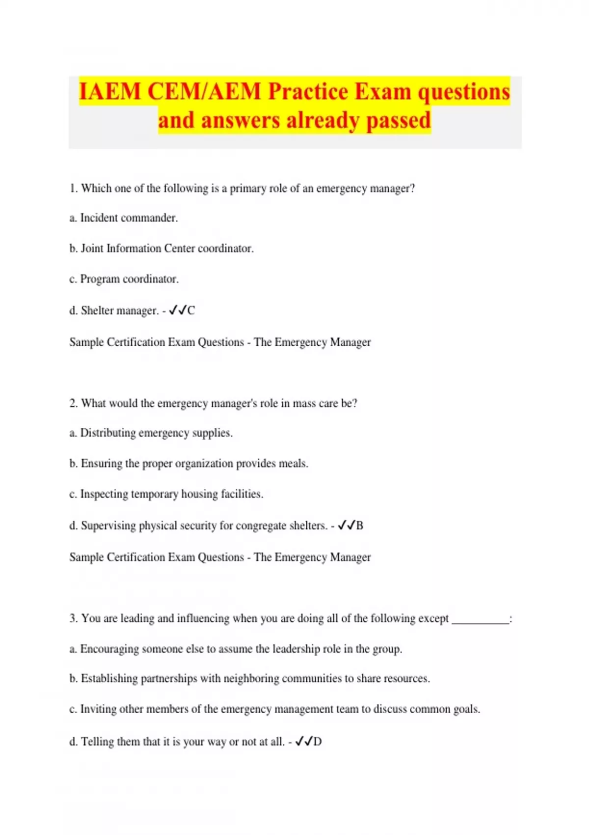 IAEM CEM/AEM Practice Exam questions and answers already passed 1. Which one of the following is a primary role of an emergency manager? a. Incident commander. b. Joint Information Center coordinator. c. Program coordinator. d. Shelter manager. - C Sample Certification Exam Questions - The Emergency Manager 2. What would the emergency manager's role in mass care be? a. Distributing emergency supplies. b. Ensuring the proper organization provides meals. c. Inspecting temporary housing facilities. d. Supervising physical security for congregate shelters. - B Sample Certification Exam Questions - The Emergency Manager 3. You are leading and influencing when you are doing all of the following except __________: a. Encouraging someone else to assume the leadership role in the group. b. Establishing partnerships with neighboring communities to share resources. c. Inviting other members of the emergency management team to discuss common goals. d. Telling them that it is your way or not at all. - D