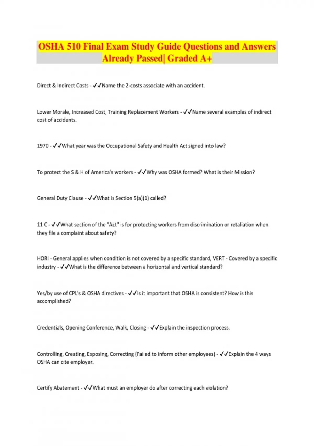 OSHA 510 Final Exam Study Guide Questions and Answers Already Passed| Graded A+ Direct & Indirect Costs - Name the 2-costs associate with an accident. Lower Morale, Increased Cost, Training Replacement Workers - Name several examples of indirect cost of accidents. 1970 - What year was the Occupational Safety and Health Act signed into law? To protect the S & H of America's workers - Why was OSHA formed? What is their Mission? General Duty Clause - What is Section 5(a)(1) called? 11 C - What section of the "Act" is for protecting workers from discrimination or retaliation when they file a complaint about safety? HORI - General applies when condition is not covered by a specific standard, VERT - Covered by a specific industry - What is the difference between a horizontal and vertical standard? Yes/by use of CPL's & OSHA directives - Is it important that OSHA is consistent? How is this accomplished?