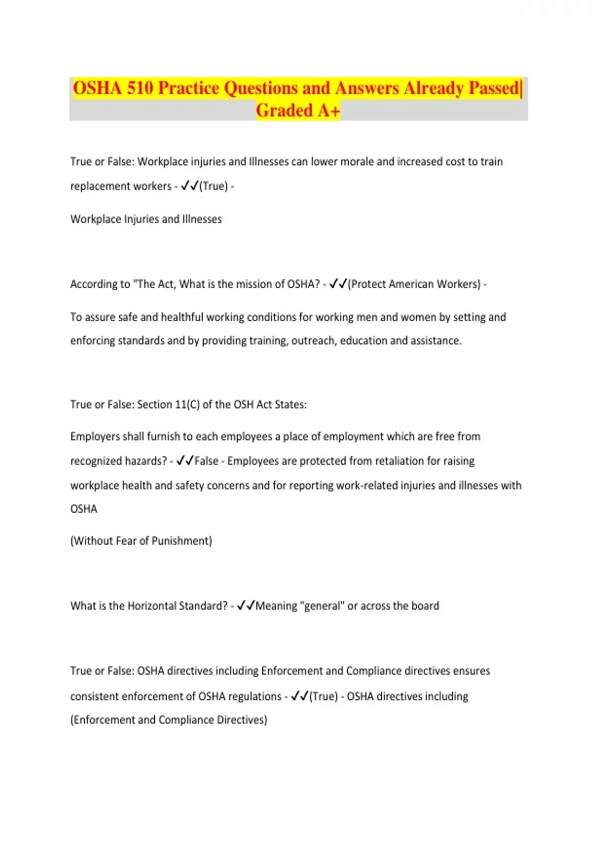 OSHA 510 Practice Questions and Answers Already Passed| Graded A+ True or False: Workplace injuries and Illnesses can lower morale and increased cost to train replacement workers - (True) - Workplace Injuries and Illnesses According to "The Act, What is the mission of OSHA? - (Protect American Workers) - To assure safe and healthful working conditions for working men and women by setting and enforcing standards and by providing training, outreach, education and assistance. True or False: Section 11(C) of the OSH Act States: Employers shall furnish to each employees a place of employment which are free from recognized hazards? - False - Employees are protected from retaliation for raising workplace health and safety concerns and for reporting work-related injuries and illnesses with OSHA (Without Fear of Punishment)